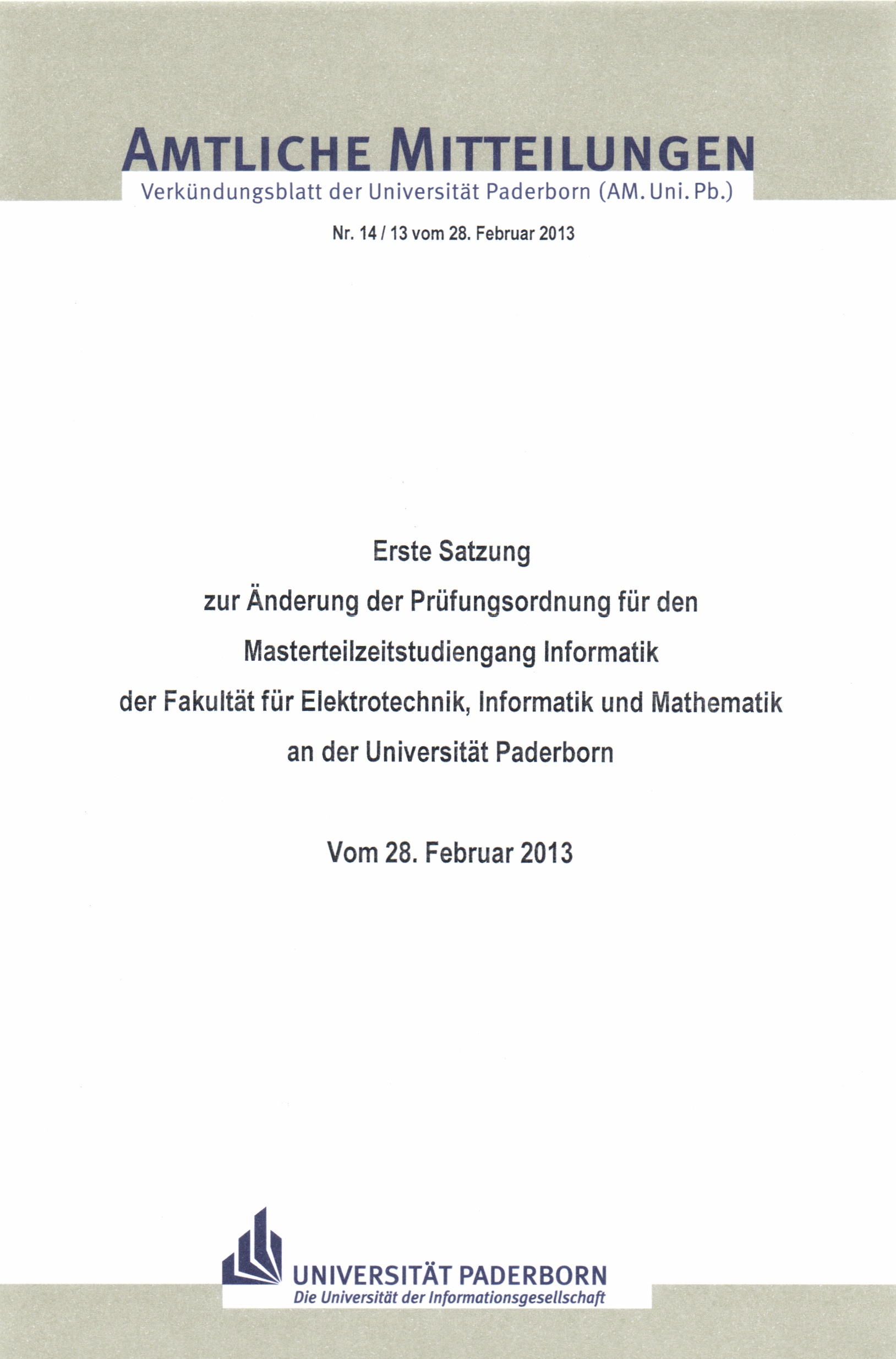 Erste Satzung zur Änderung der Prüfungsordnung für den Masterteilzeitstudiengang Informatik der Fakultät für Elektrotechnik, Informatik und Mathematik an der Universität Paderborn : vom 28. Februar 2013