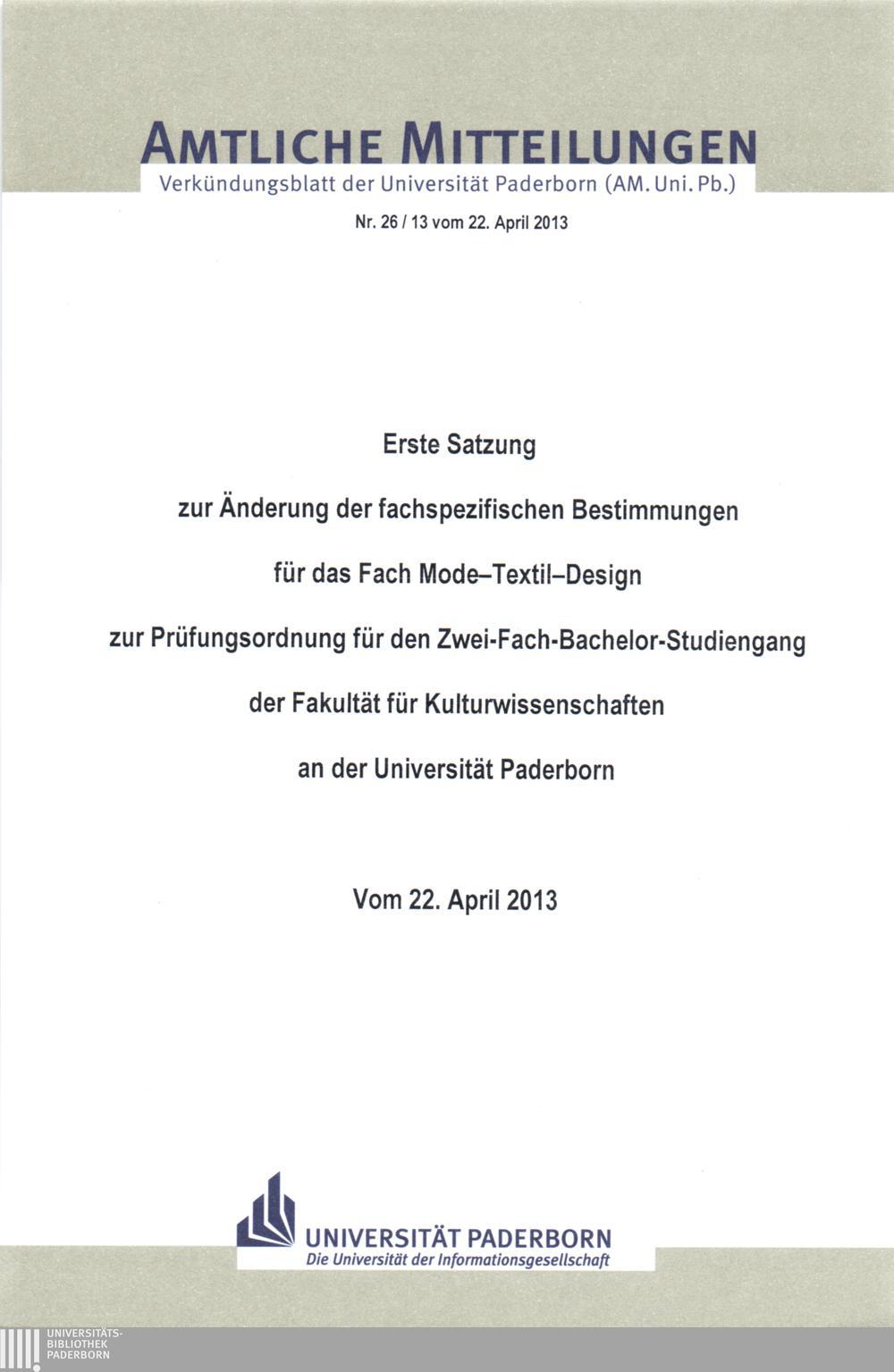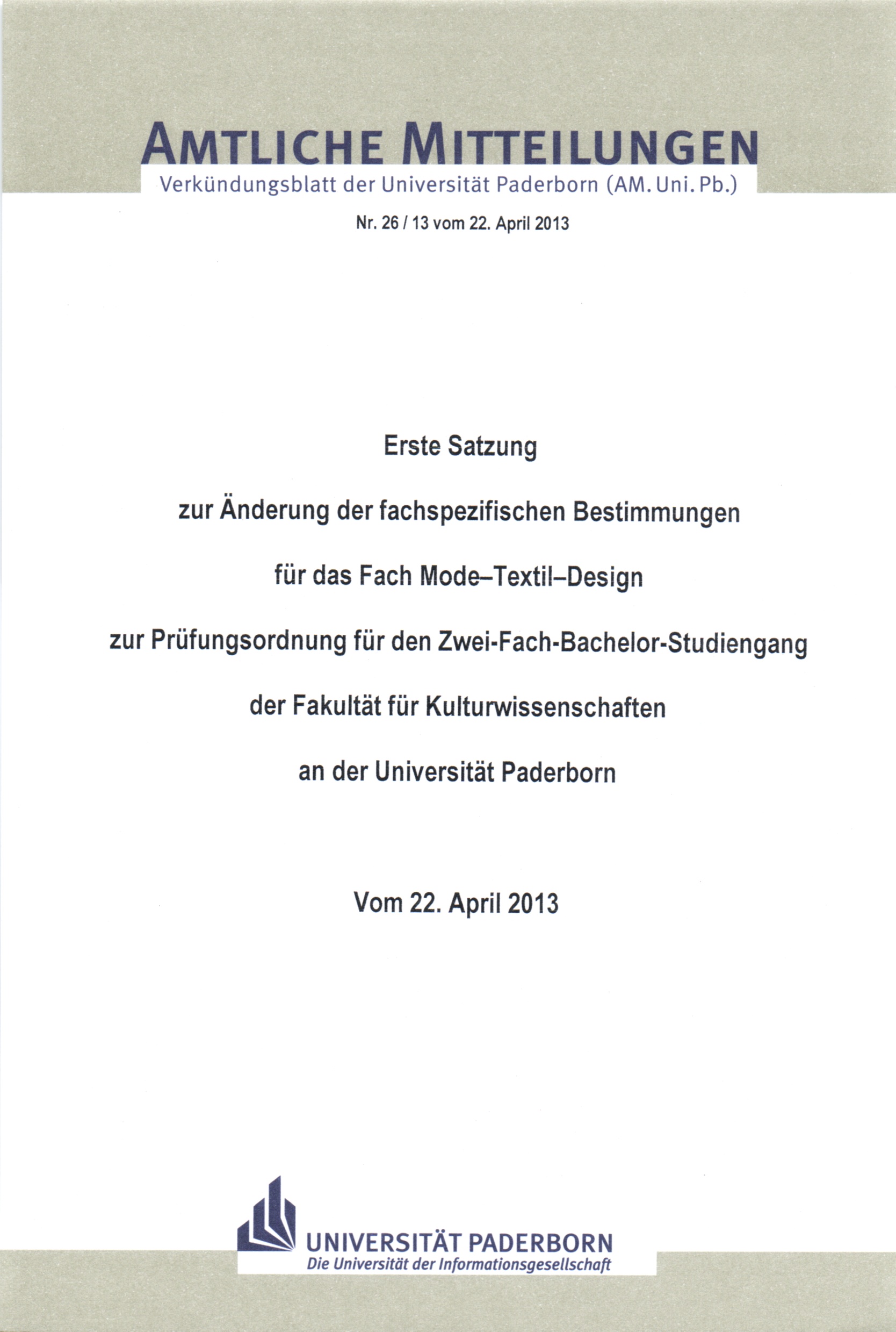 Erste Satzung zur Änderung der fachspezifischen Bestimmungen für das Fach Mode-Textil-Design zur Prüfungsordnung für den Zwei-Fach-Bachelor-Studiengang der Fakultät für Kulturwissenschaften an der Universität Paderborn : vom 22. April 2013