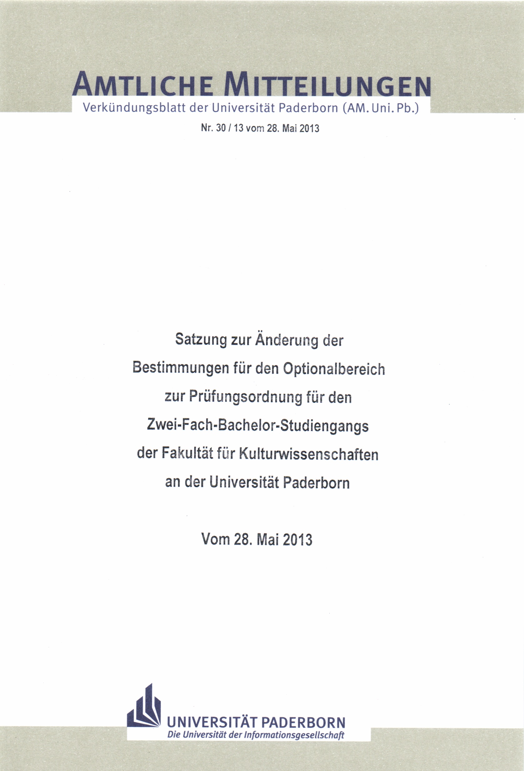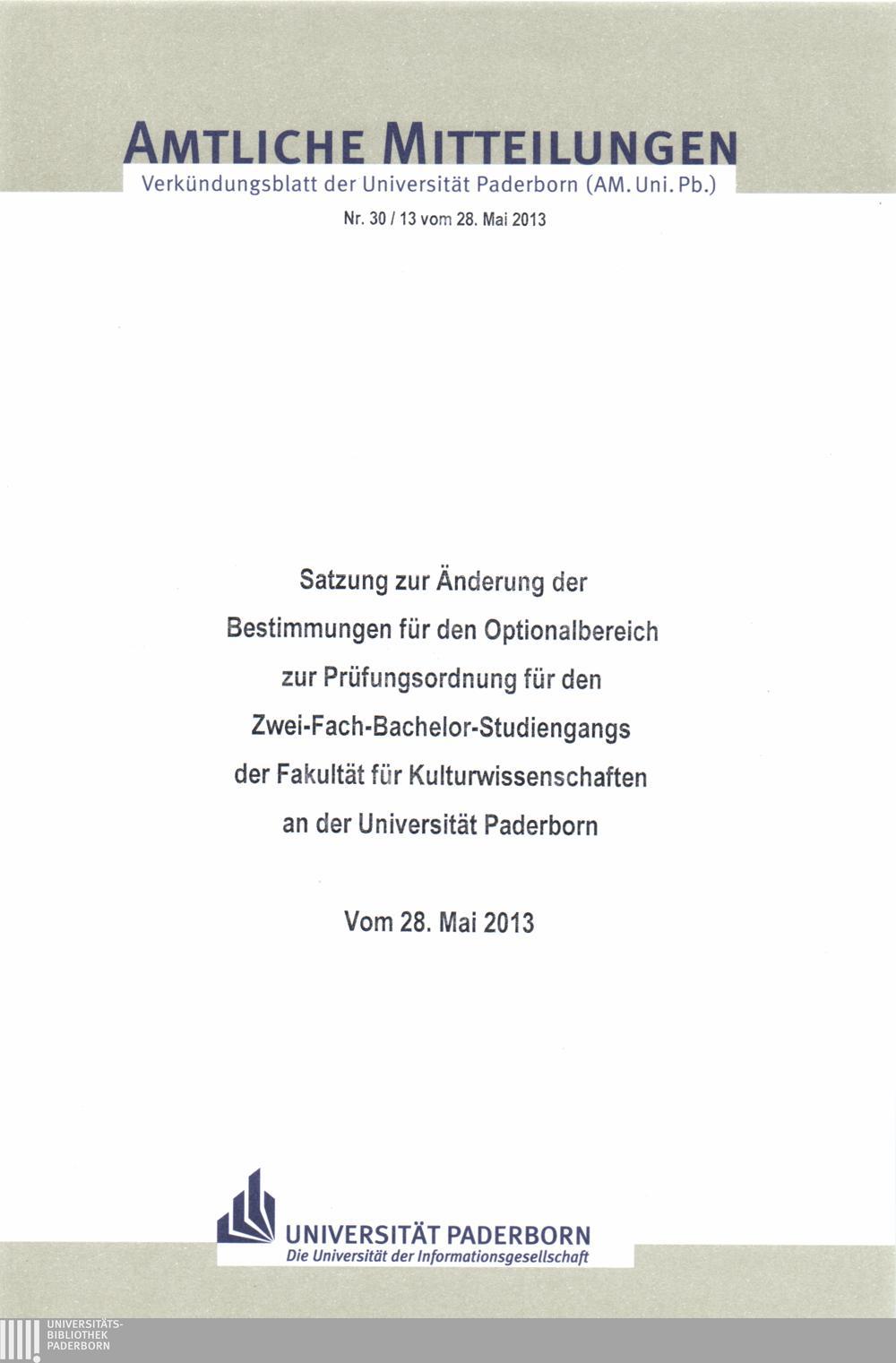 Satzung zur Änderung der Bestimmungen für den Optionalbereich zur Prüfungsordnung für den Zwei-Fach-Bachelor-Studiengang der Fakultät für Kulturwissenschaften an der Universität Paderborn : vom 28. Mai 2013