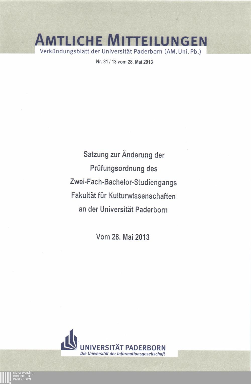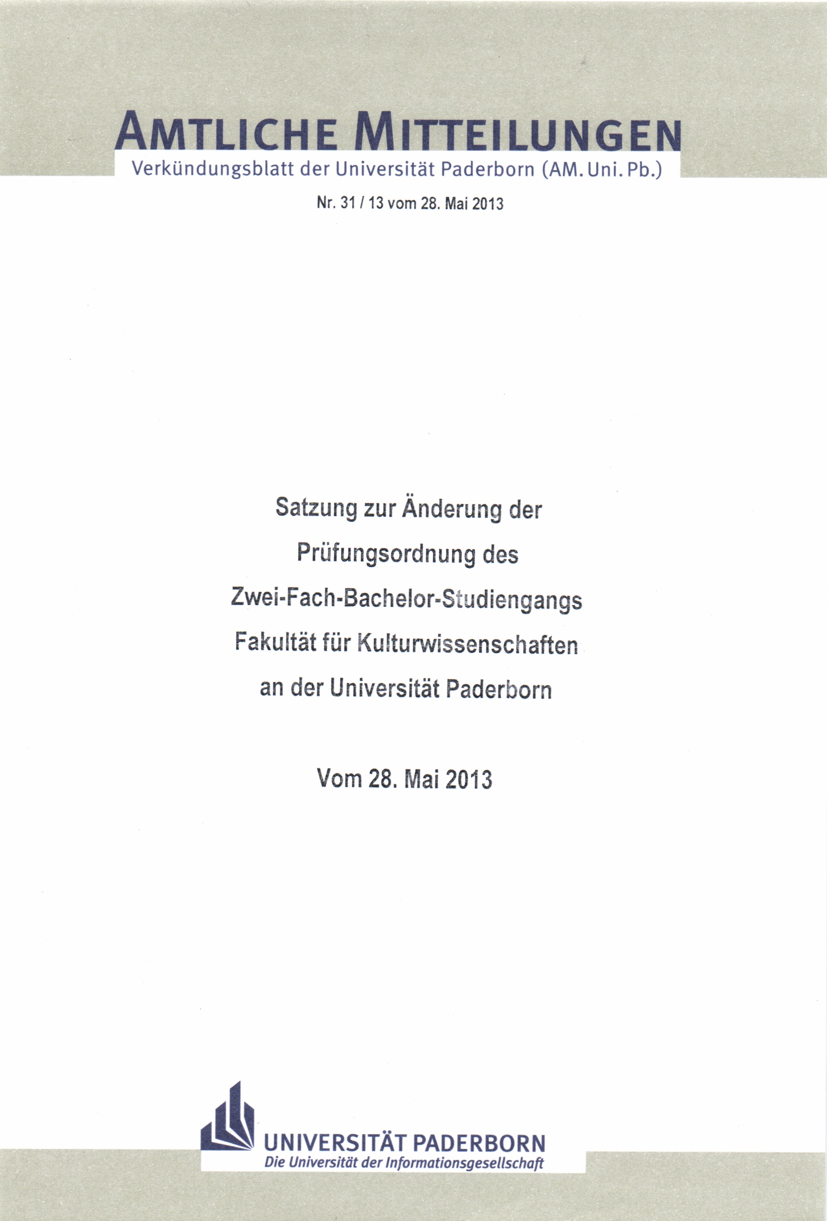 Satzung zur Änderung der Prüfungsordnung des Zwei-Fach-Bachelor-Studiengangs, Fakultät für Kulturwissenschaften, an der Universität Paderborn : vom 28. Mai 2013