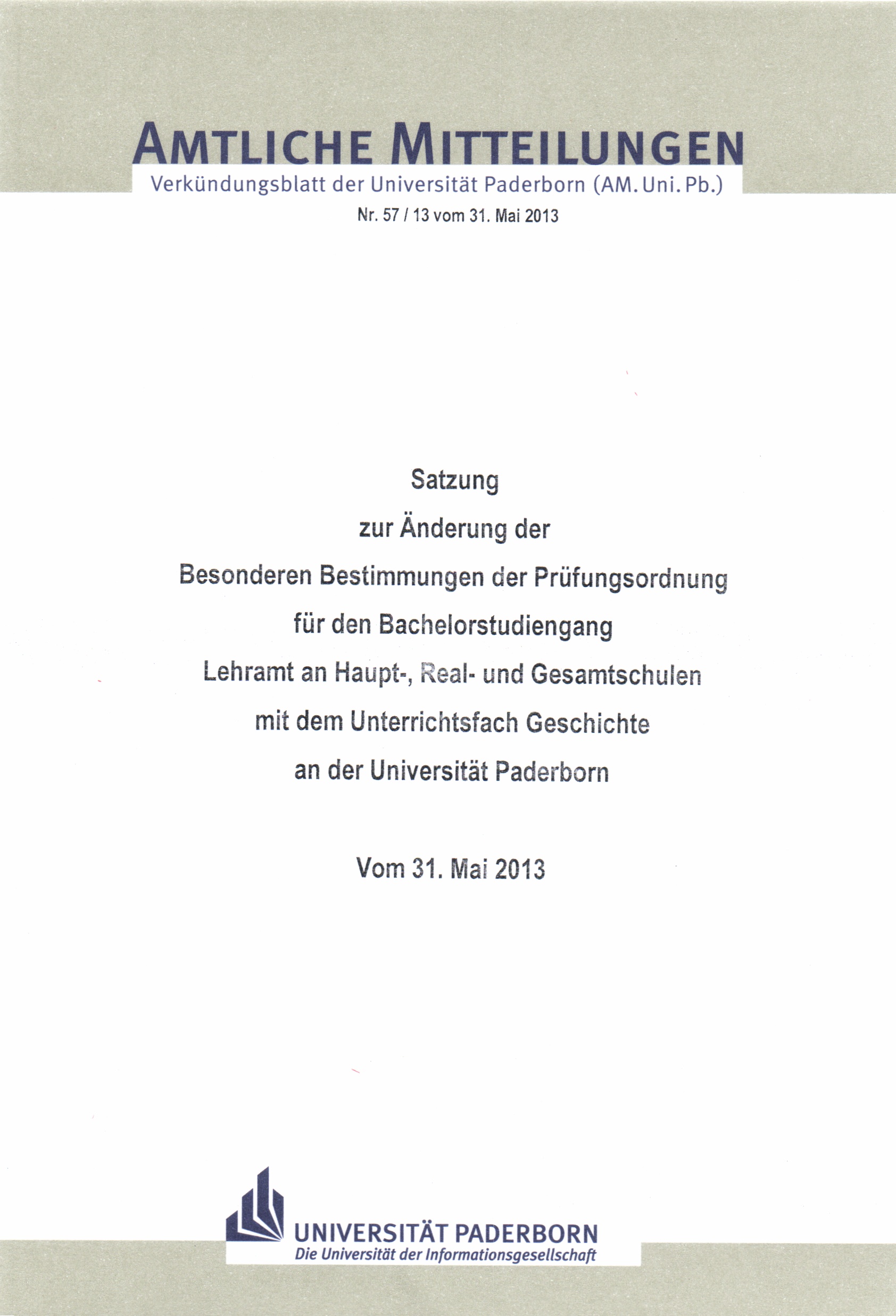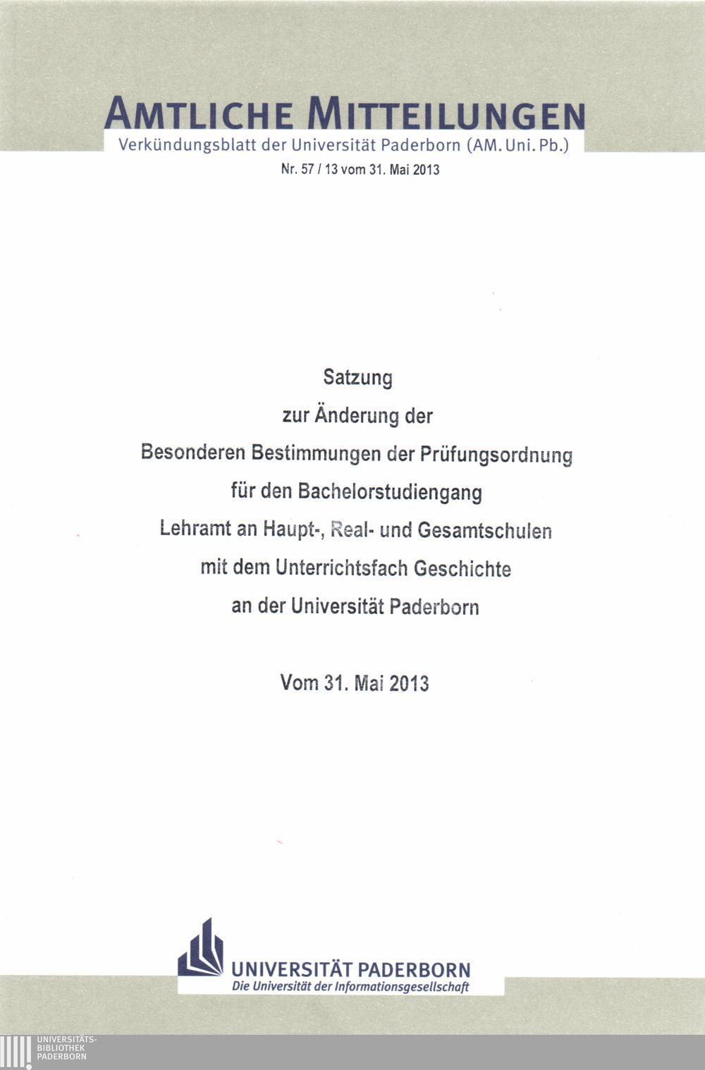 Satzung zur Änderung der Besonderen Bestimmungen der Prüfungsordnung für den Bachelorstudiengang Lehramt an Haupt-, Real- und Gesamtschulen mit dem Unterrichtsfach Geschichte an der Universität Paderborn : vom 31. Mai 2013