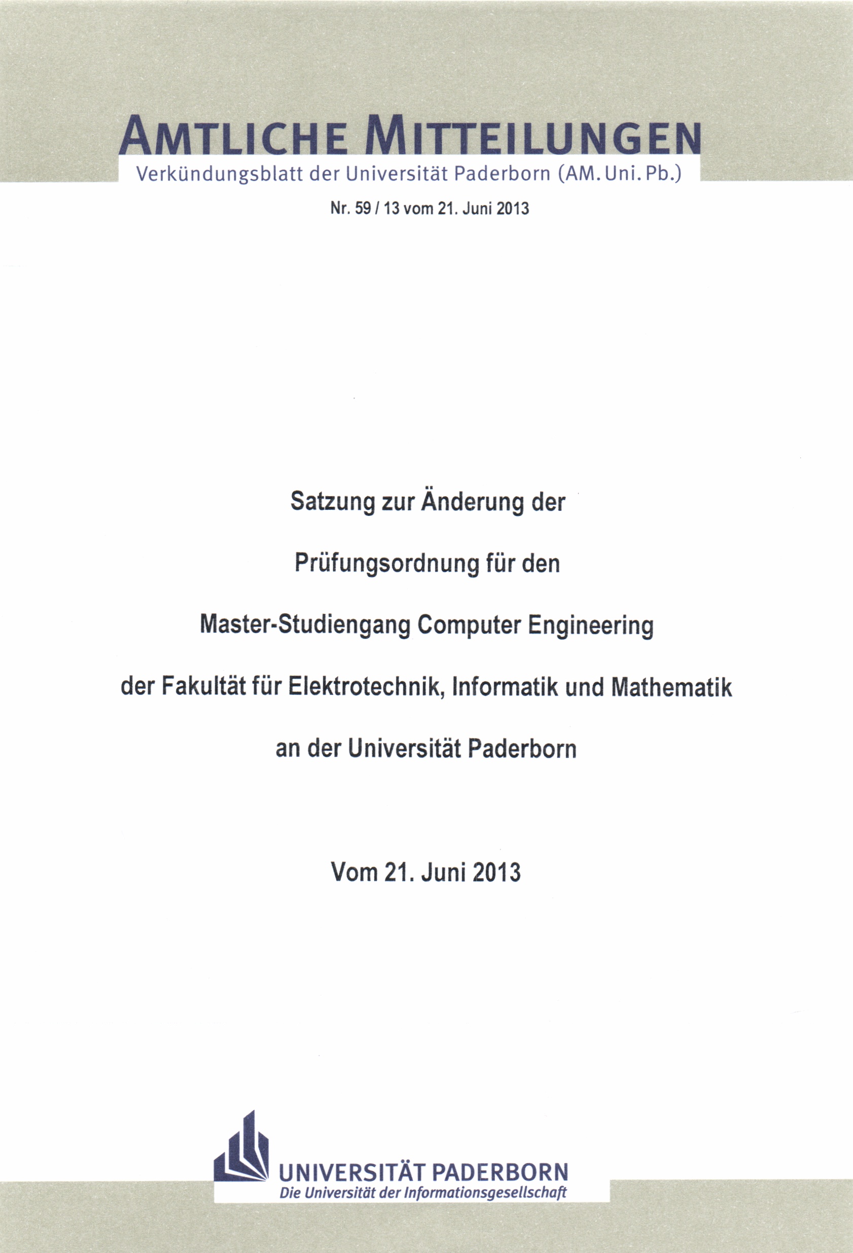 Satzung zur Änderung der Prüfungsordnung für den Master-Studiengang Computer Engineering der Fakultät für Elektrotechnik, Informatik und Mathematik an der Universität Paderborn : vom 21. Juni 2013
