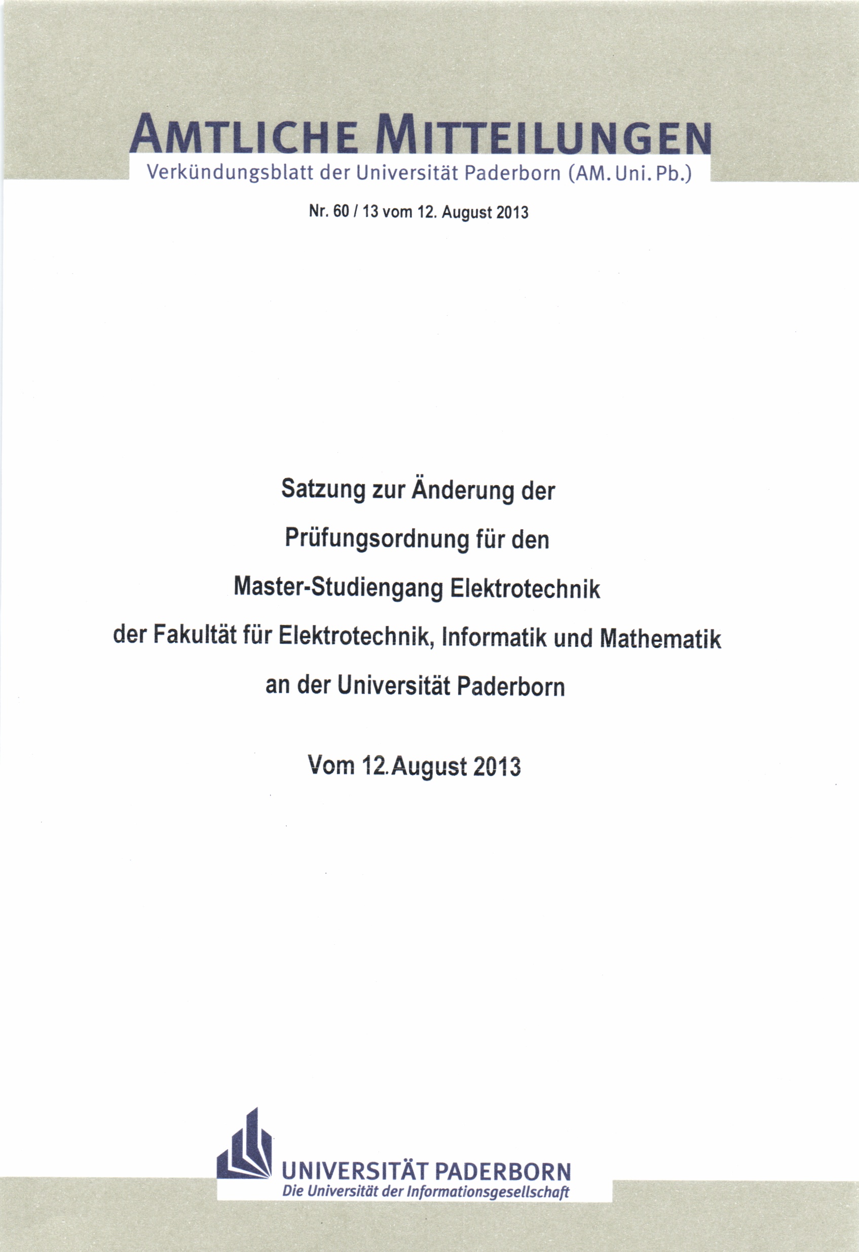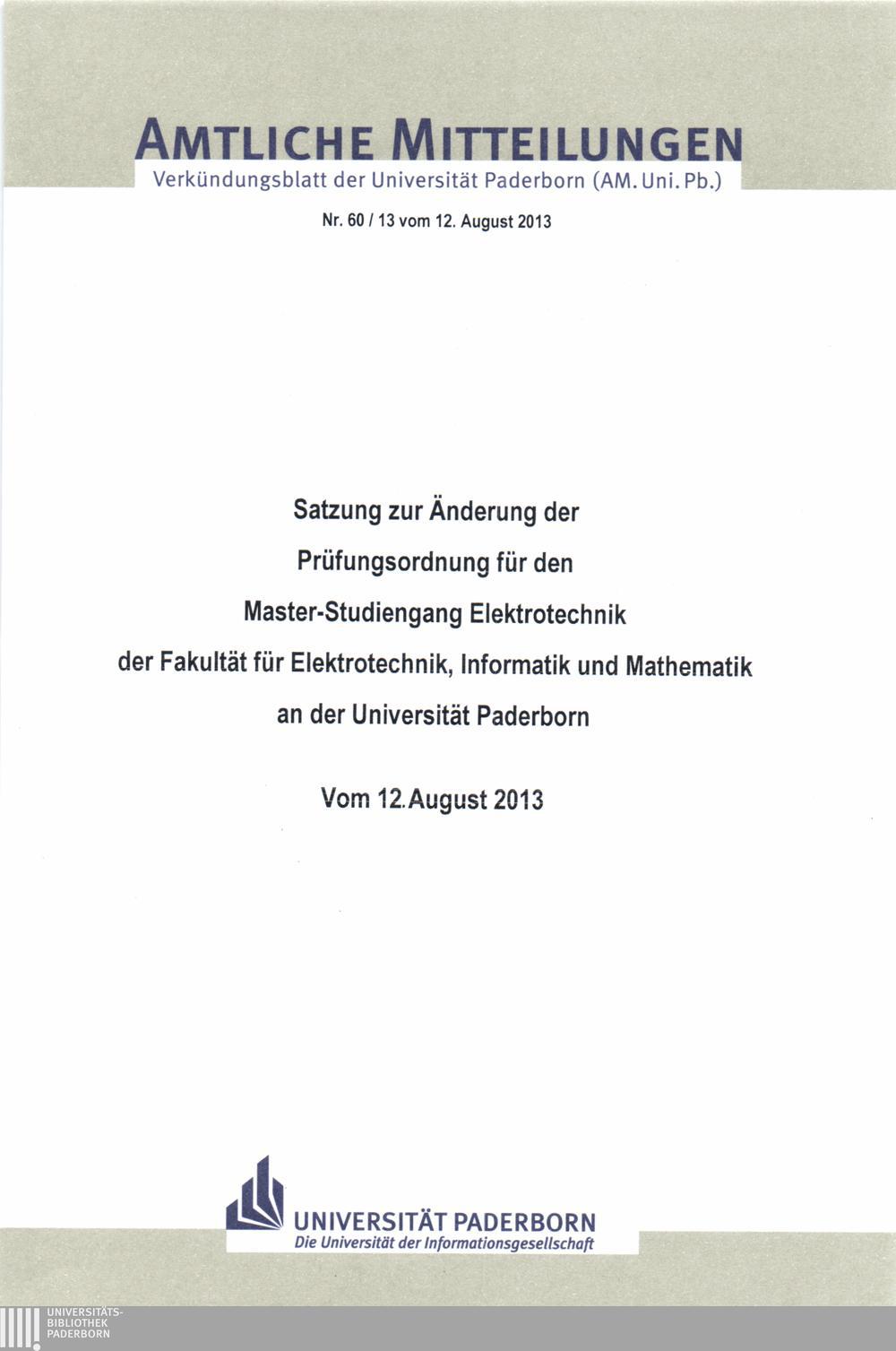 Satzung zur Änderung der Prüfungsordnung für den Master-Studiengang Elektrotechnik der Fakultät für Elektrotechnik, Informatik und Mathematik an der Universität Paderborn : vom 12. August 2013