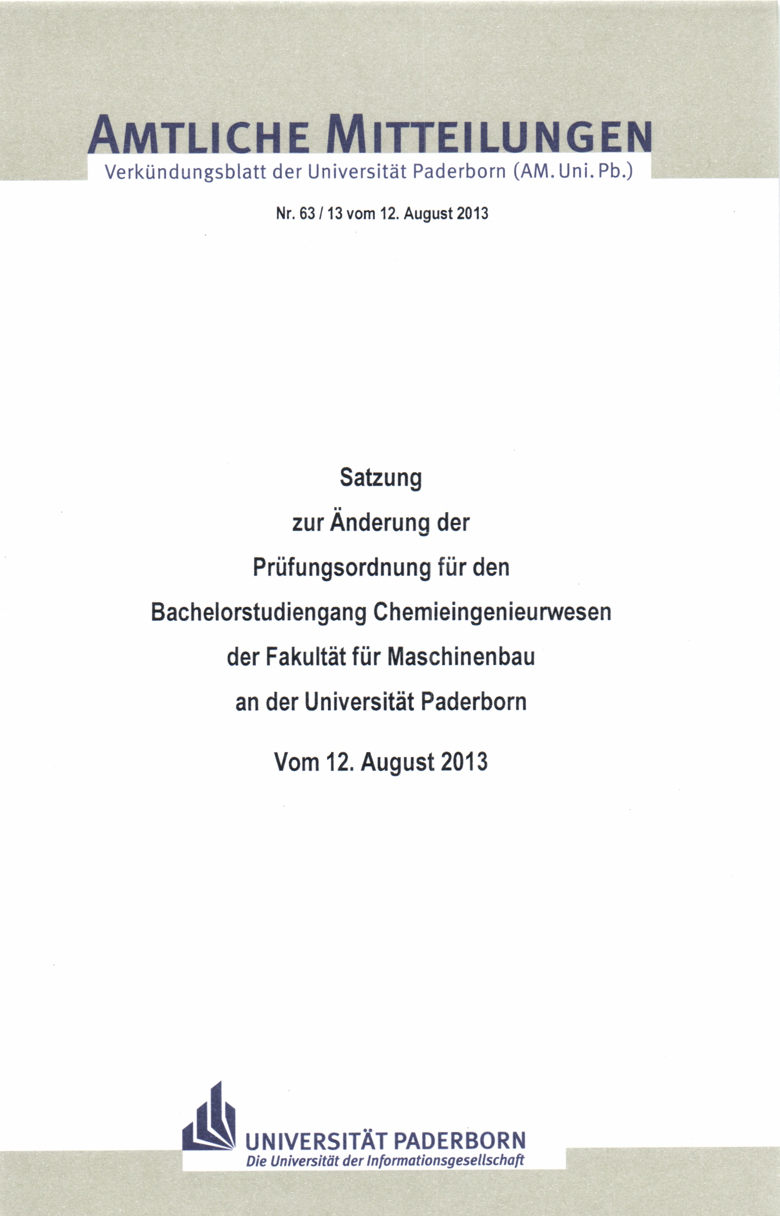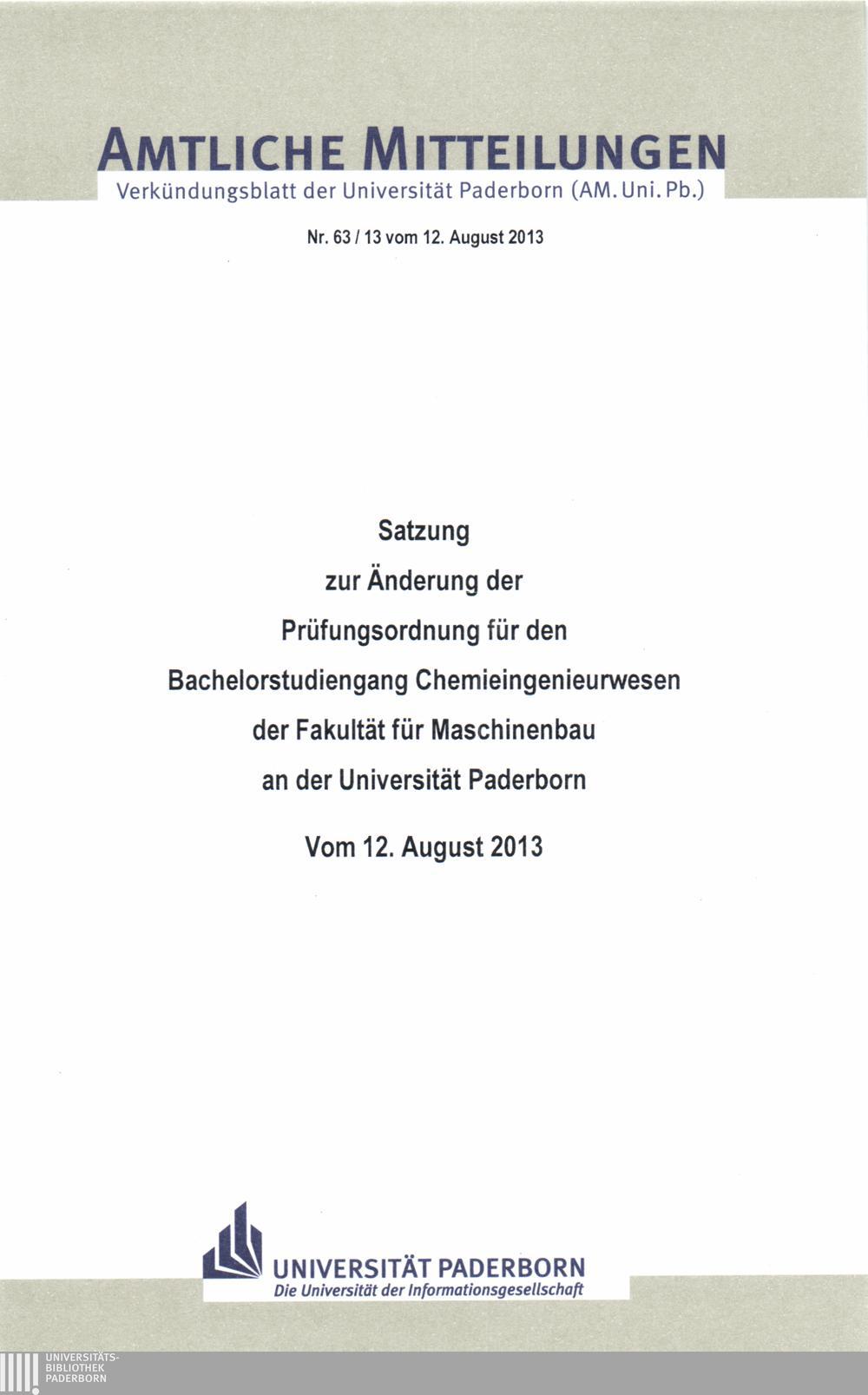 Satzung zur Änderung der Prüfungsordnung für den Bachelorstudiengang Chemieingenieurwesen der Fakultät für Maschinenbau an der Universität Paderborn : vom 12. August 2013