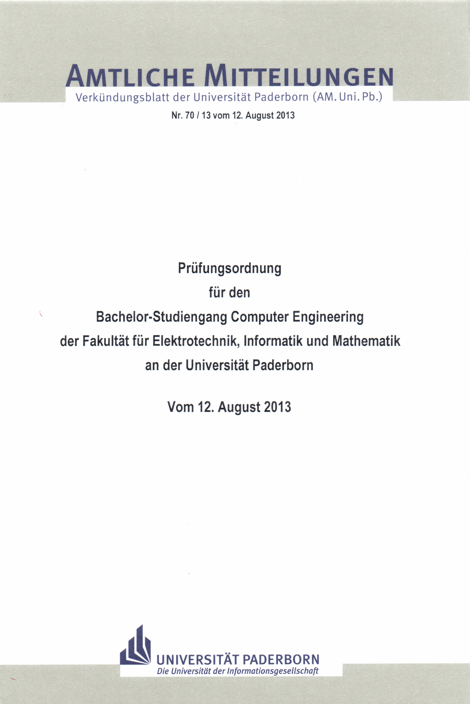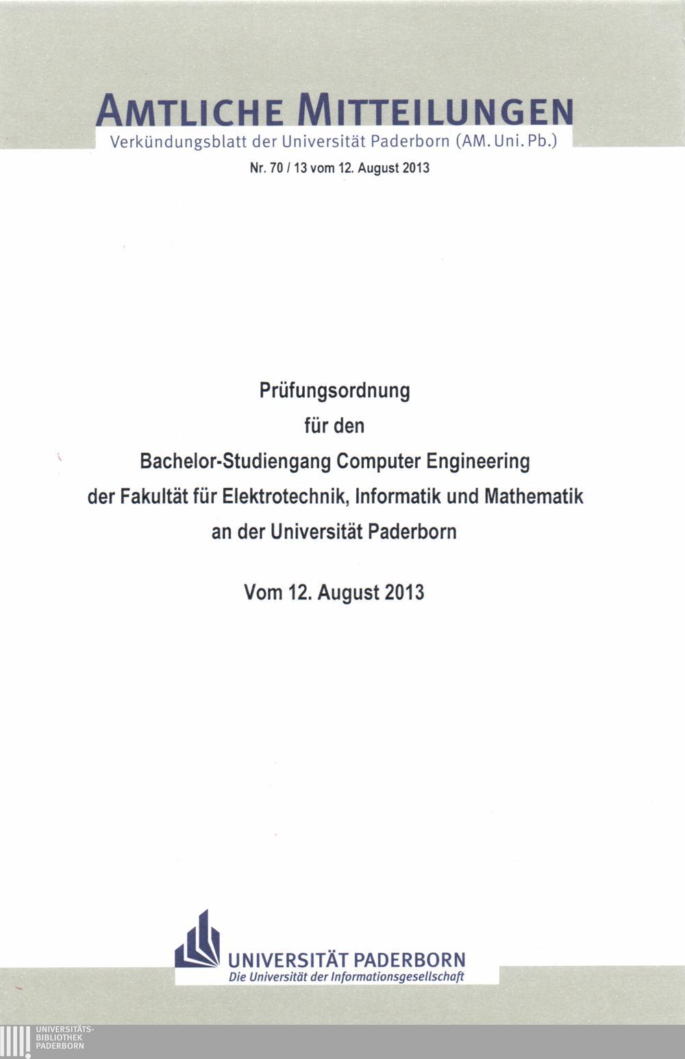 Prüfungsordnung für den Bachelor-Studiengang Computer Engineering der Fakultät für Elektrotechnik, Informatik und Mathematik an der Universität Paderborn : vom 12. August 2013