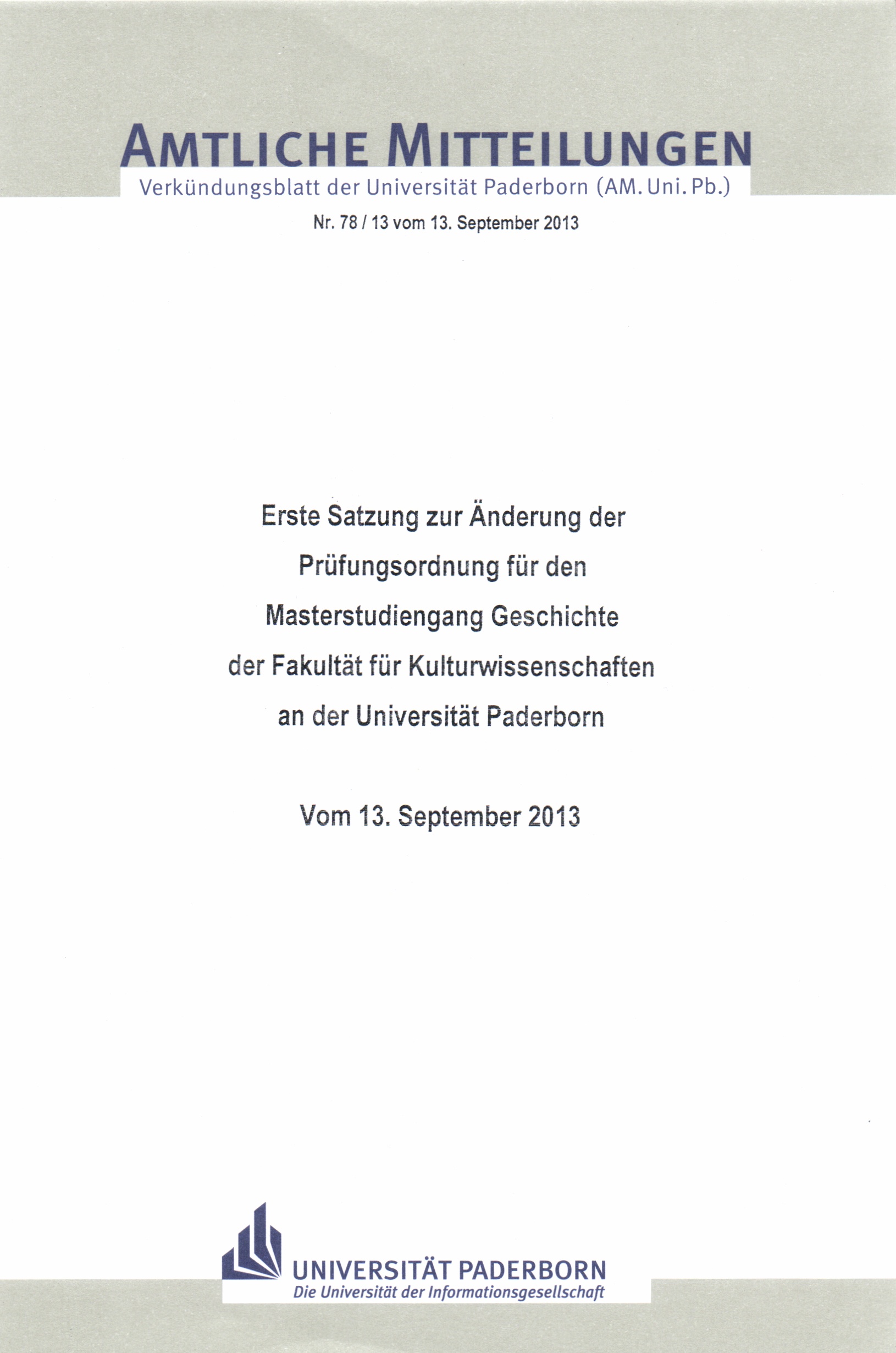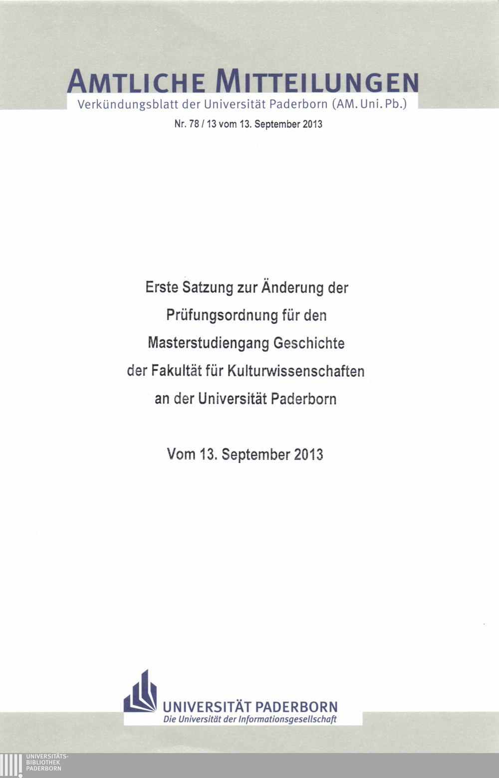 Erste Satzung zur Änderung der Prüfungsordnung für den Masterstudiengang Geschichte der Fakultät für Kulturwissenschaften an der Universität Paderborn : vom 13. September 2013