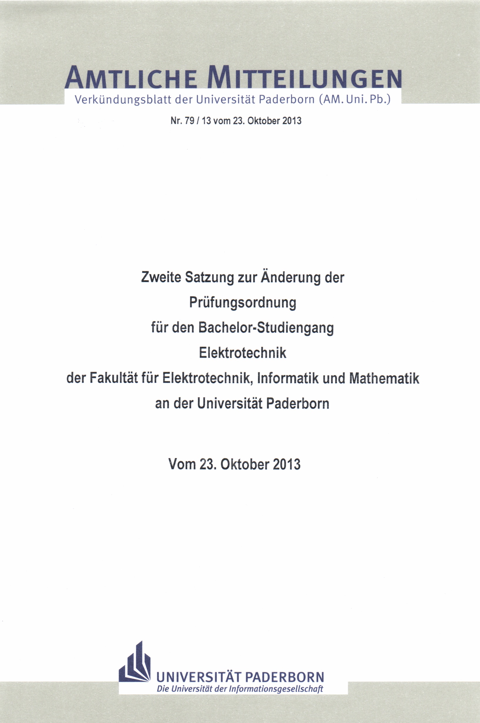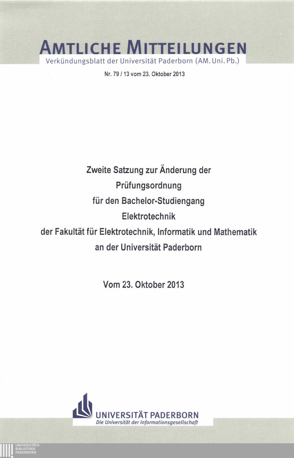Zweite Satzung zur Änderung der Prüfungsordnung für den Bachelor-Studiengang Elektrotechnik der Fakultät für Elektrotechnik, Informatik und Mathematik an der Universität Paderborn : vom 23. Oktober 2013