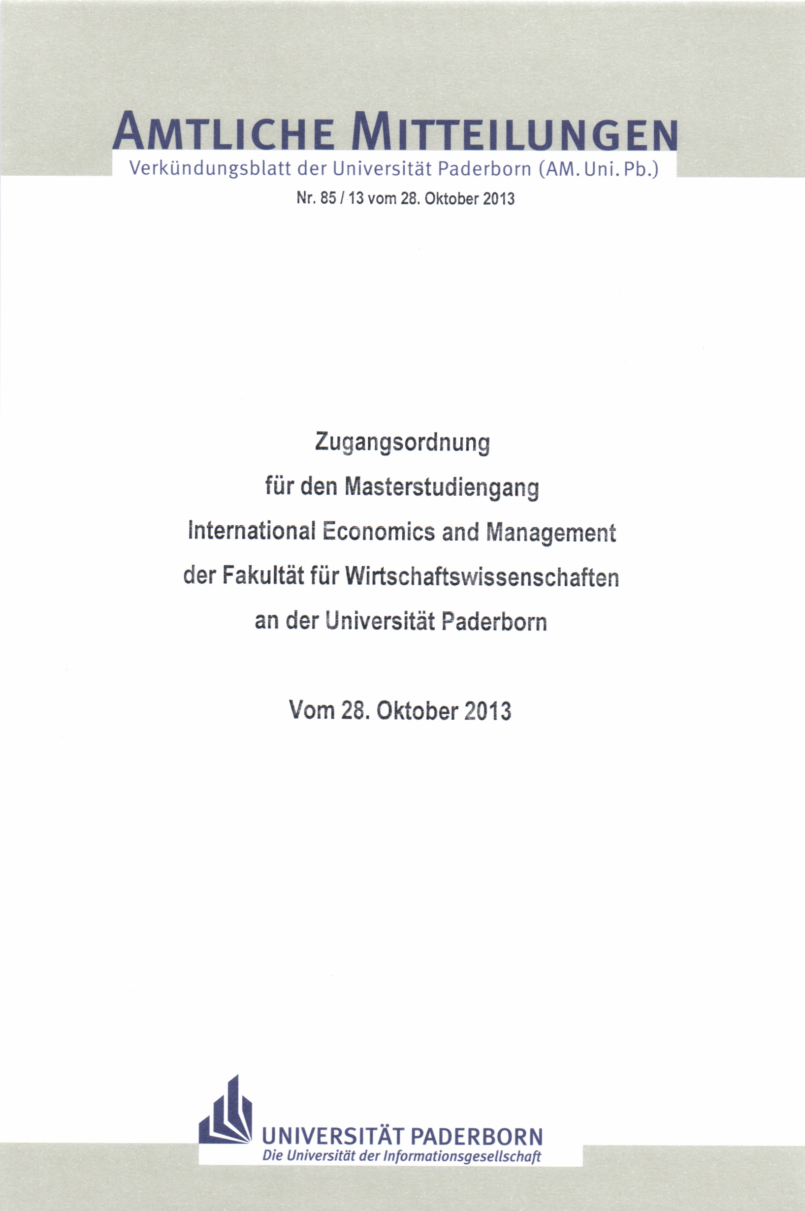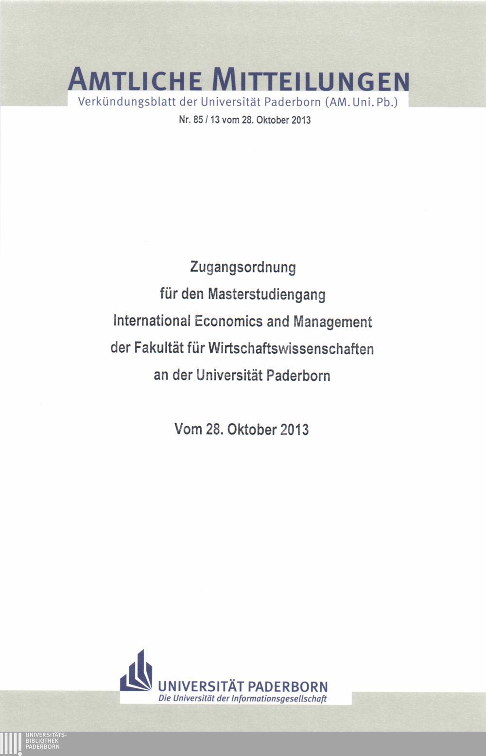 Zugangsordnung für den Masterstudiengang International Economics and Management der Fakultät für Wirtschaftswissenschaften an der Universität Paderborn : vom 28. Oktober 2013