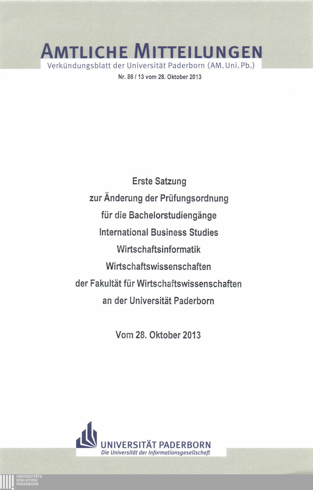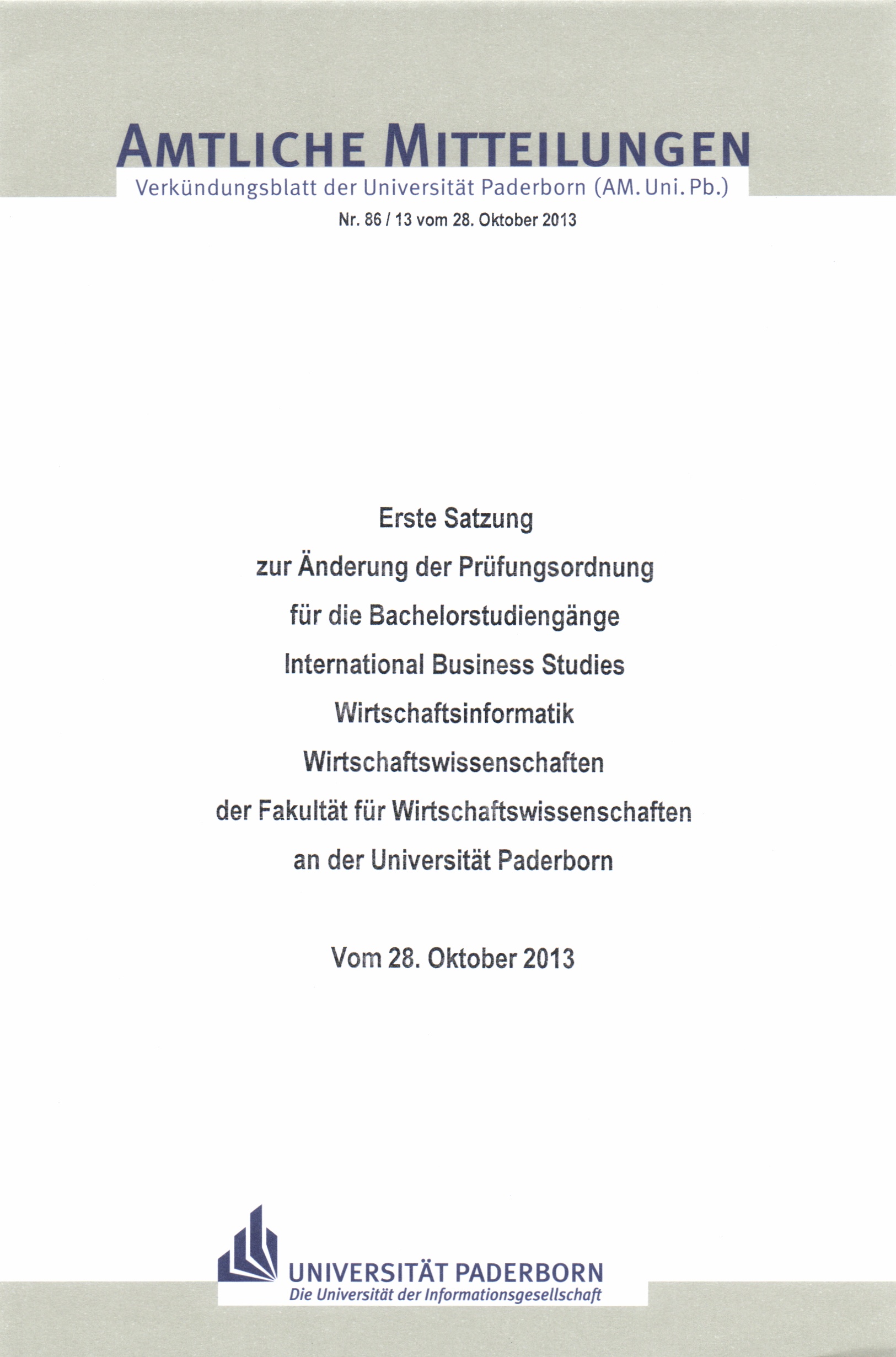 Erste Satzung zur Änderung der Prüfungsordnung für die Bachelorstudiengänge International Business Studies, Wirtschaftsinformatik, Wirtschaftswissenschaften der Fakultät für Wirtschaftswissenschaften an der Universität Paderborn : vom 28. Oktober 2013