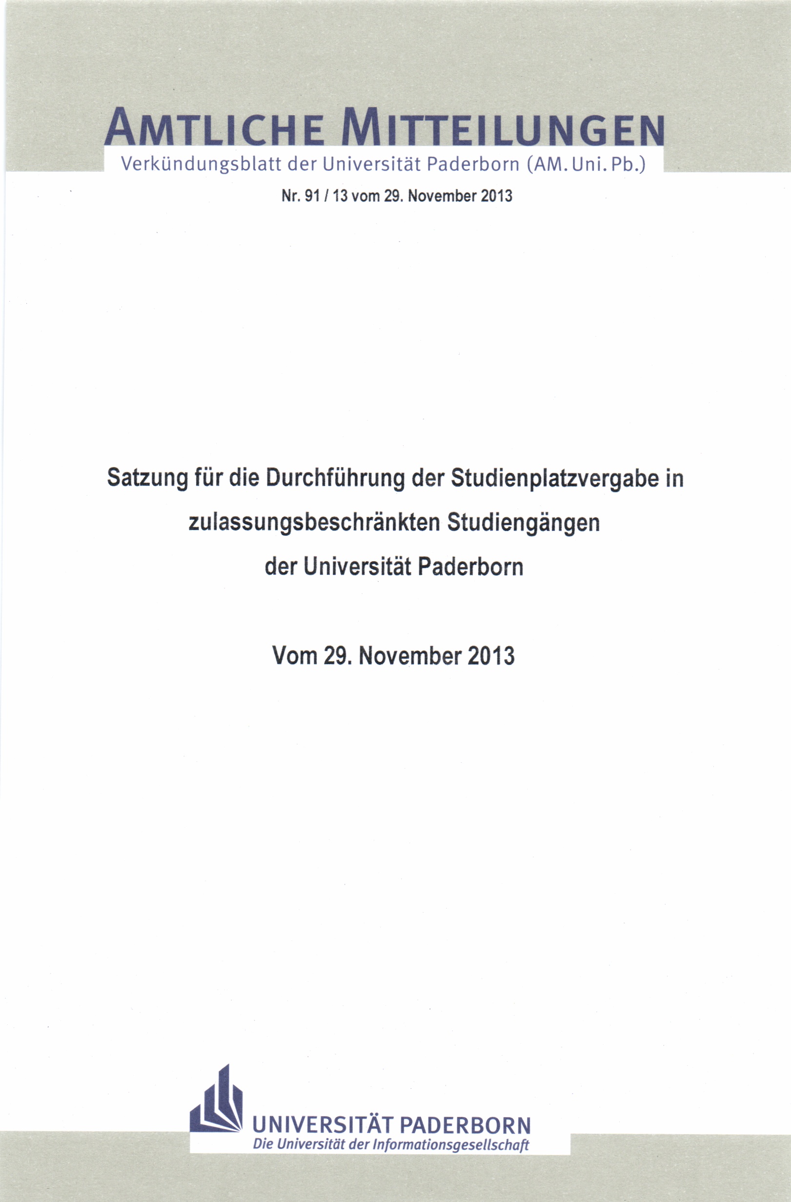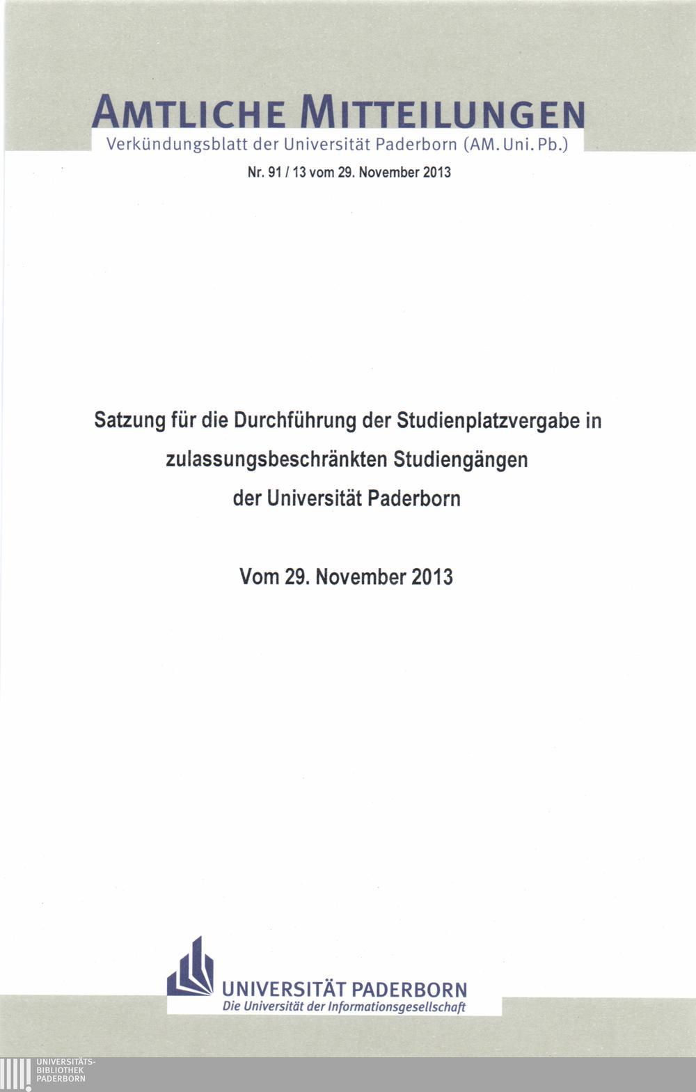 Satzung für die Durchführung der Studienplatzvergabe in zulassungsbeschränkten Studiengängen der Universität Paderborn : vom 29. November 2013