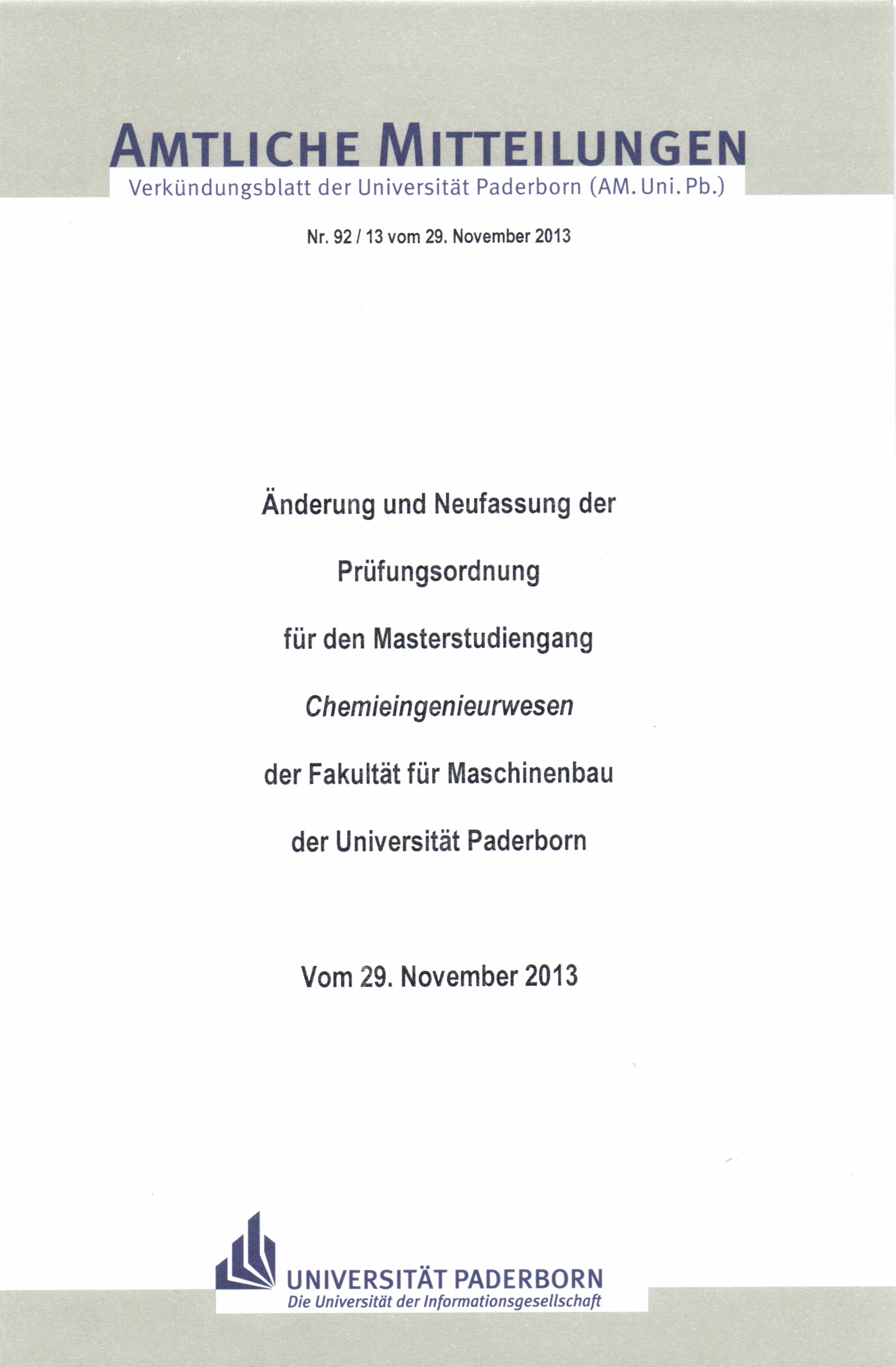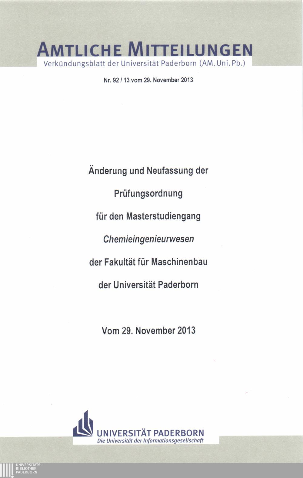 Änderung und Neufassung der Prüfungsordnung für den Masterstudiengang "Chemieingenieurwesen" der Fakultät für Maschinenbau der Universität Paderborn : vom 29. November 2013