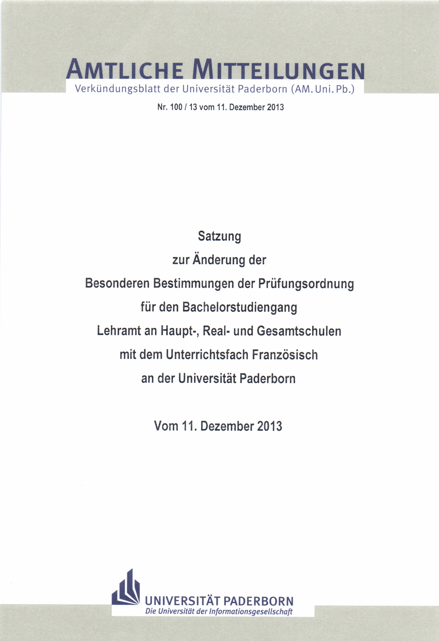 Satzung zur Änderung der Besonderen Bestimmungen der Prüfungsordnung für den Bachelorstudiengang Lehramt an Haupt-, Real- und Gesamtschulen mit dem Unterrichtsfach Französisch an der Universität Paderborn : vom 11. Dezember 2013