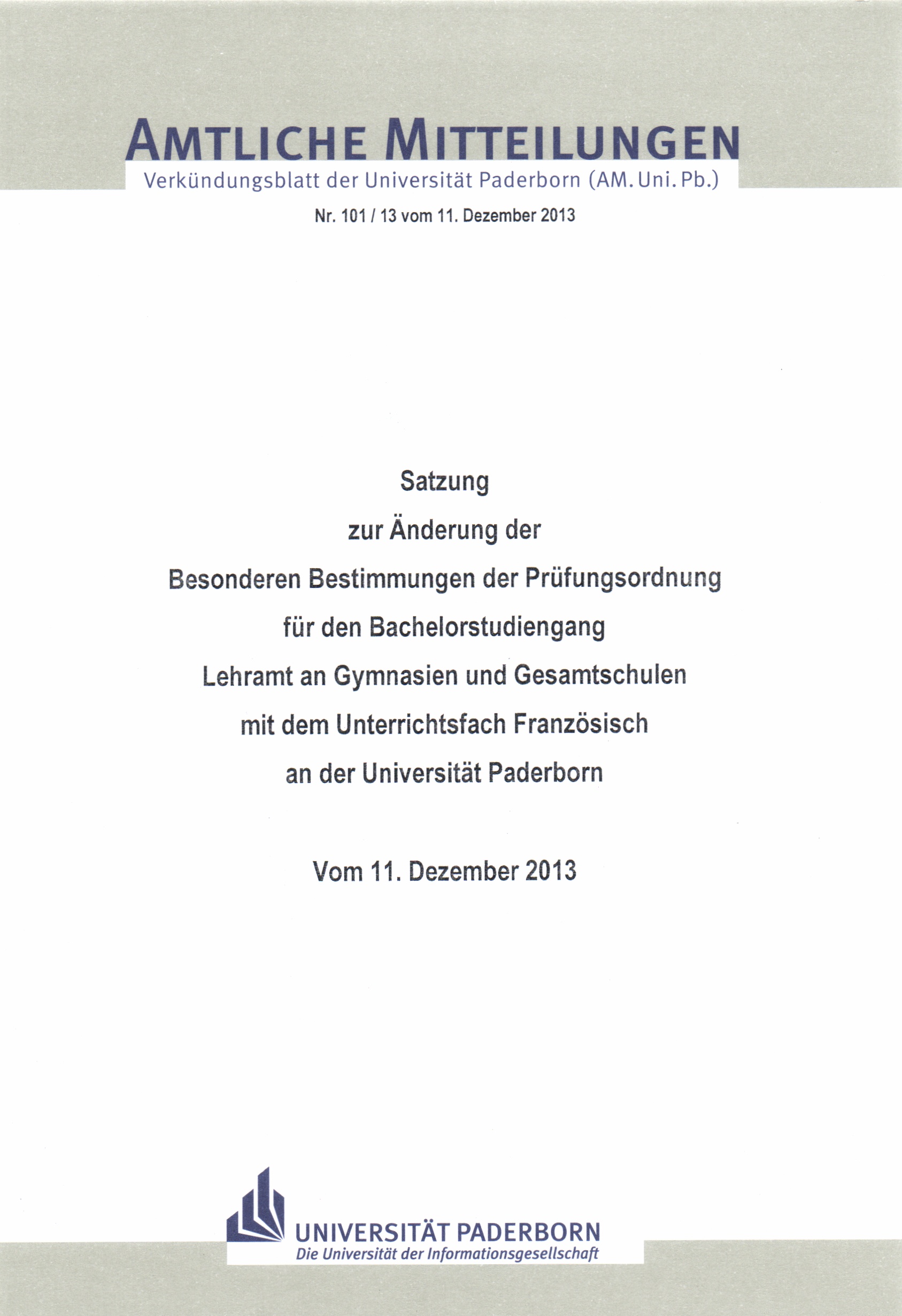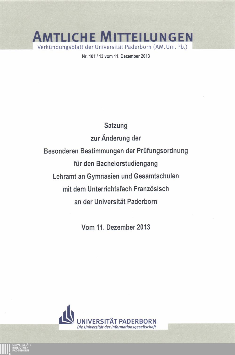 Satzung zur Änderung der Besonderen Bestimmungen der Prüfungsordnung für den Bachelorstudiengang Lehramt an Gymnasien und Gesamtschulen mit dem Unterrichtsfach Französisch an der Universität Paderborn : vom 11. Dezember 2013