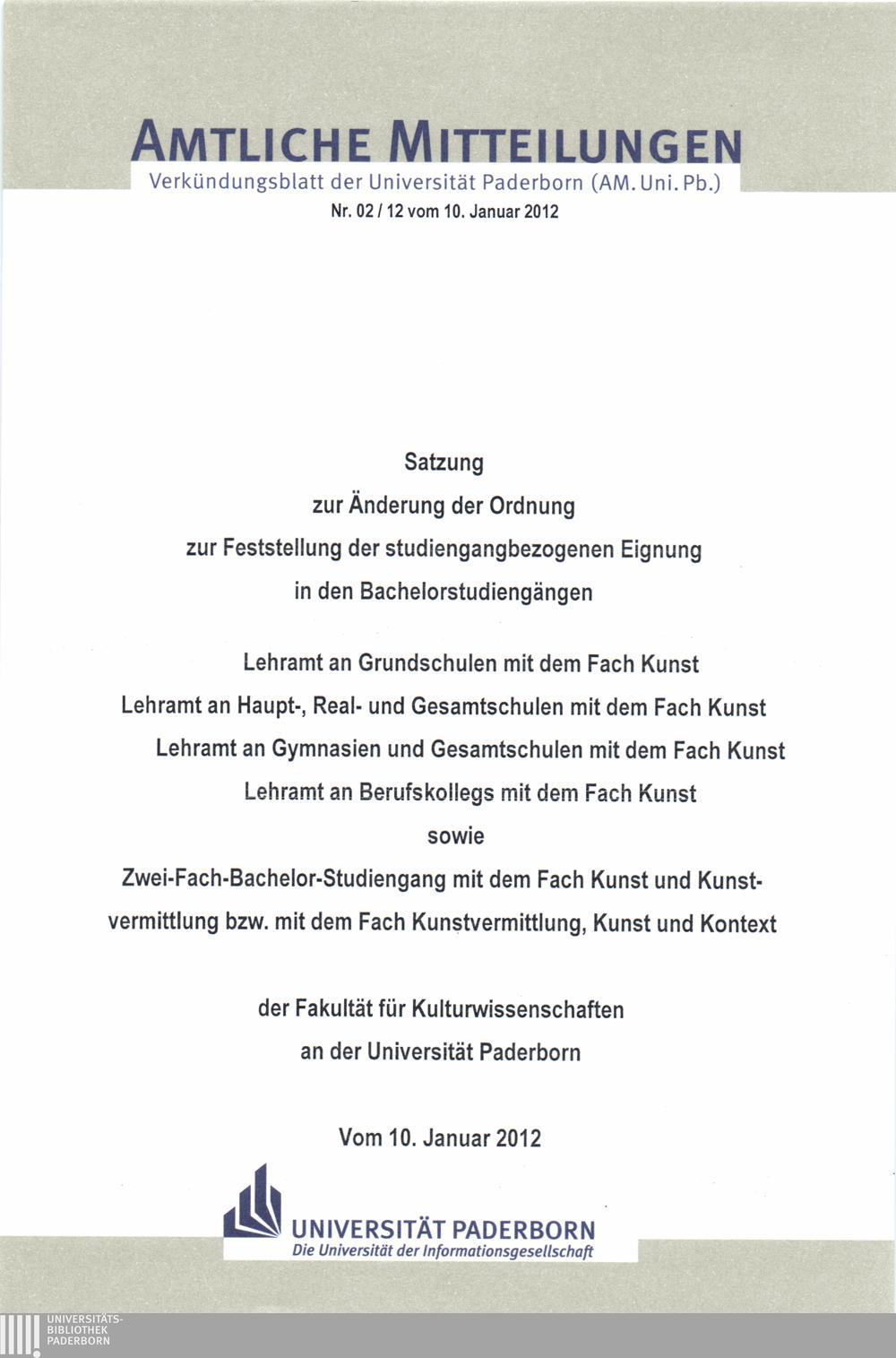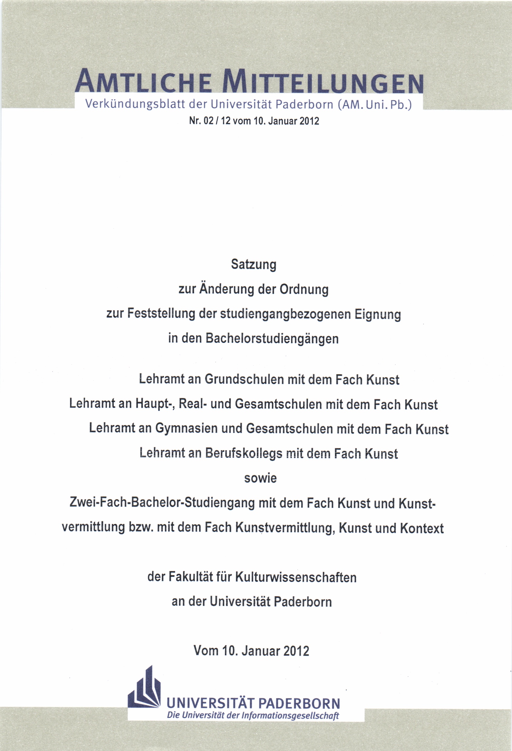 Satzung zur Änderung der Ordnung zur Feststellung der studiengangbezogenen Eignung in den Bachelorstudiengängen "Lehramt an Grundschulen mit dem Fach Kunst, Lehramt an Haupt-, Real- und Gesamtschulen mit dem Fach Kunst, Lehramt an Gymnasien und Gesamtschulen mit dem Fach Kunst, Lehramt an Berufskollegs mit dem Fach Kunst", sowie "Zwei-Fach-Bachelor-Studiengang mit dem Fach Kunst und Kunstvermittlung bzw. mit dem Fach Kunstvermittlung, Kunst und Kontext" der Fakultät für Kulturwissenschaften an der Universität Paderborn : vom 10. Januar 2012