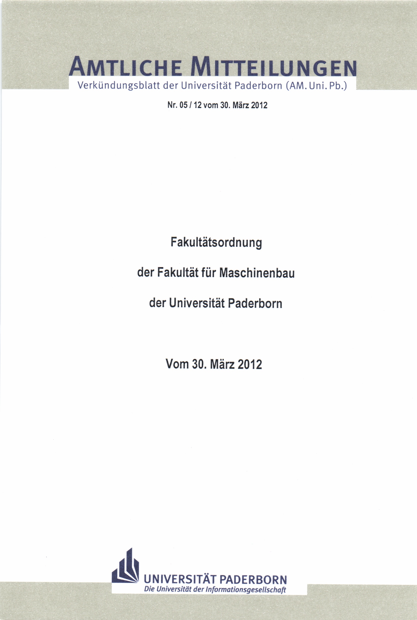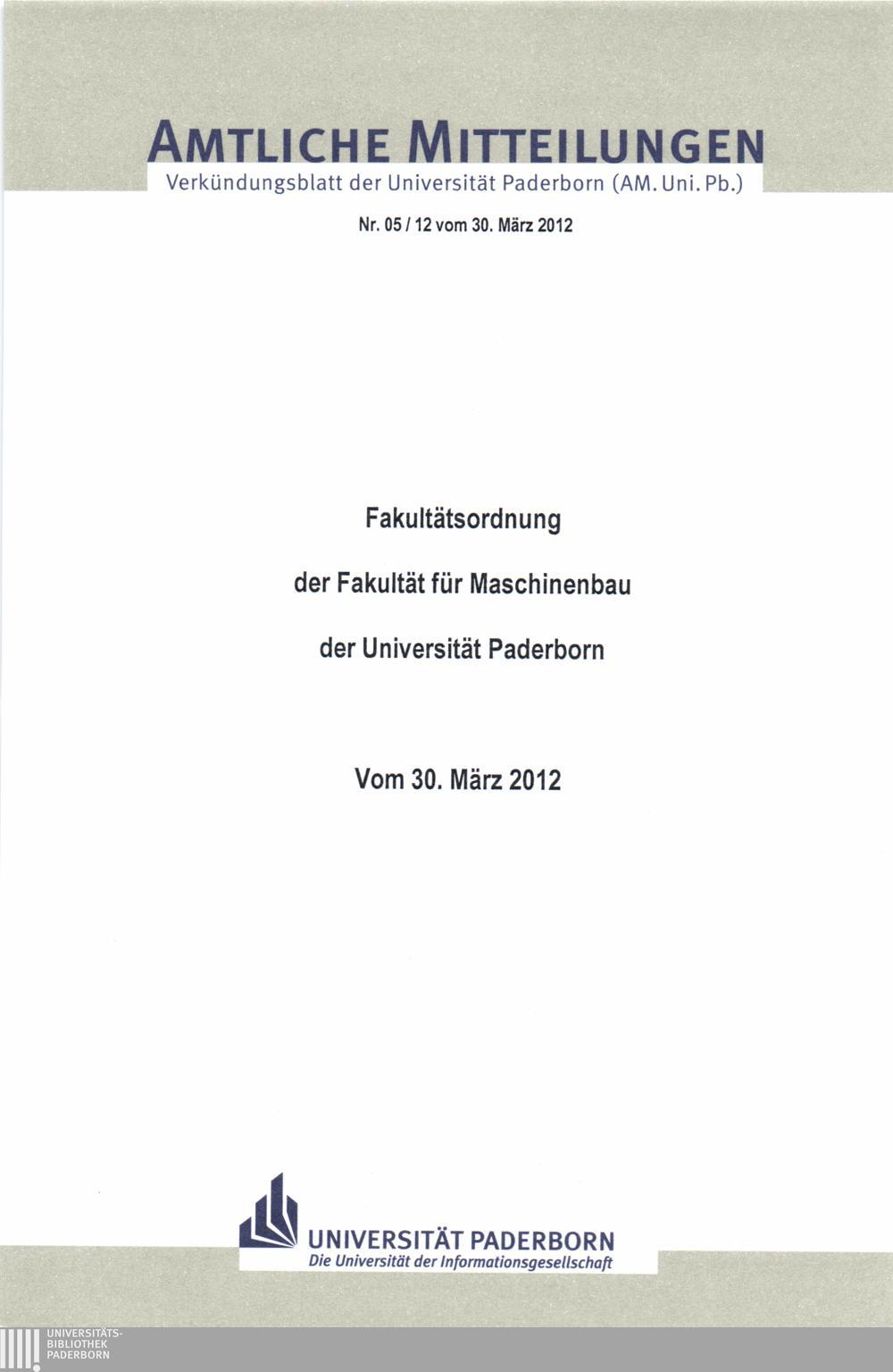 Fakultätsordnung der Fakultät für Maschinenbau der Universität Paderborn : vom 30. März 2012