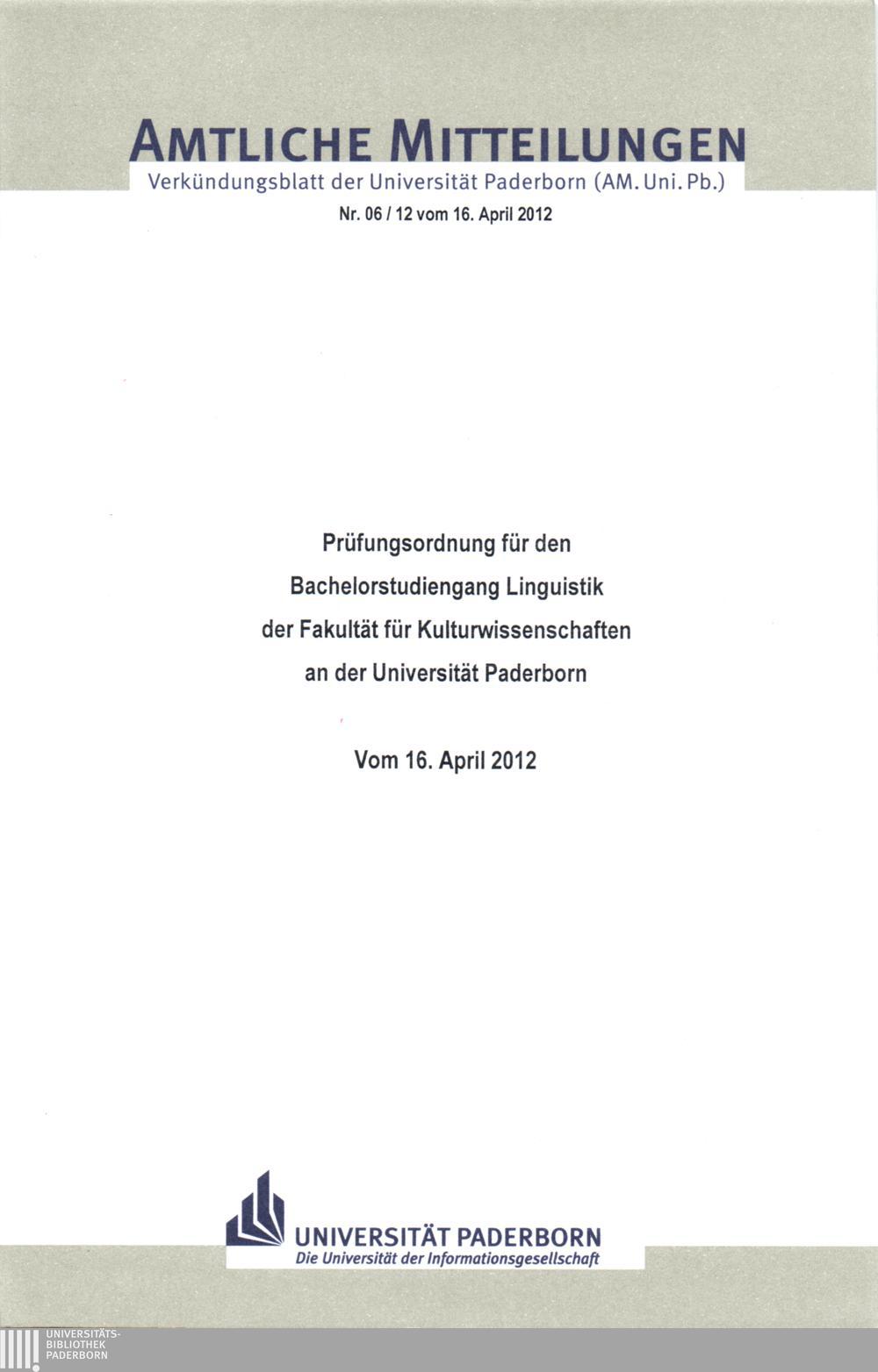 Prüfungsordnung für den Bachelorstudiengang Linguistik der Fakultät für Kulturwissenschaften an der Universität Paderborn : vom 16. April 2012