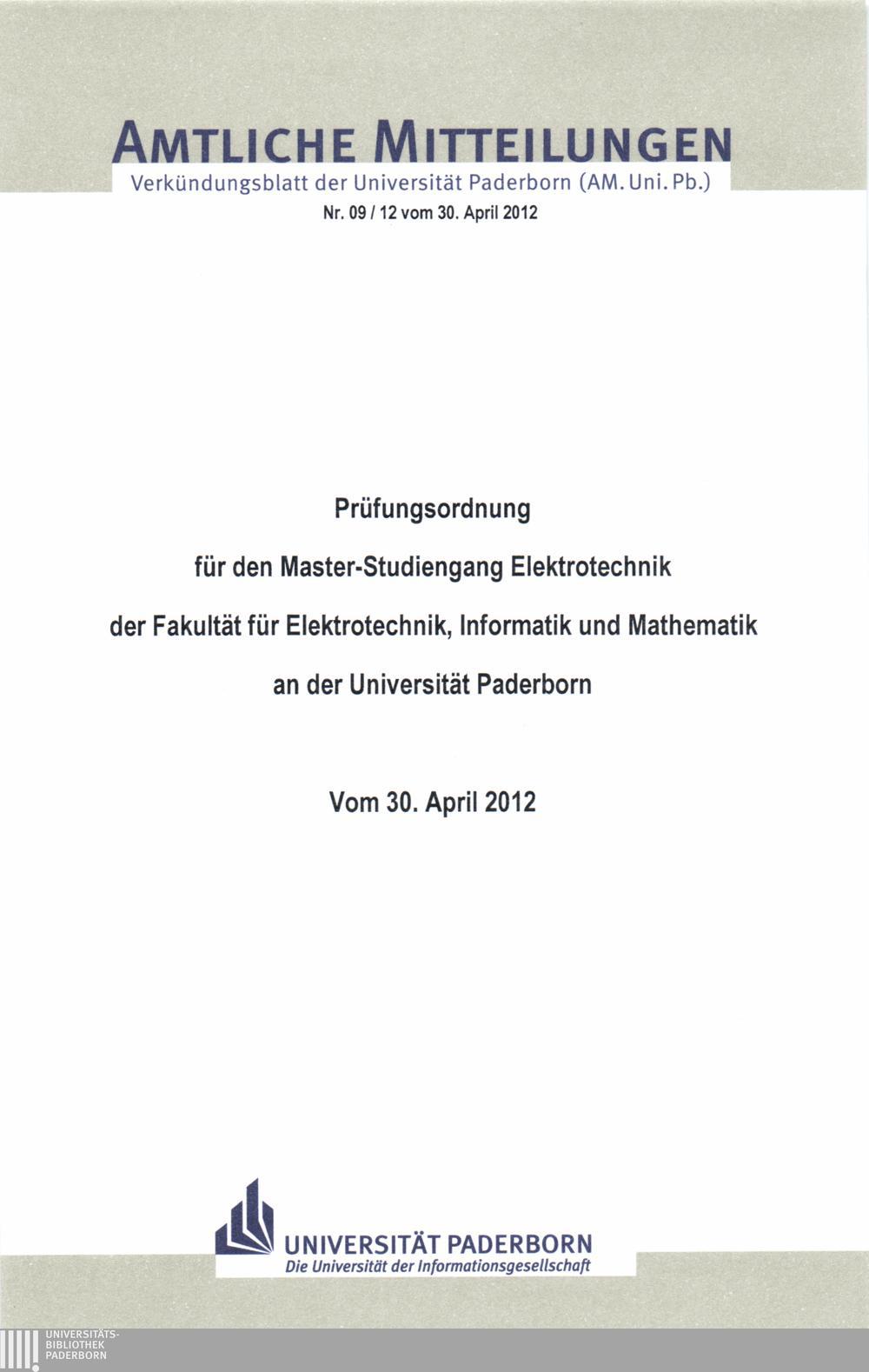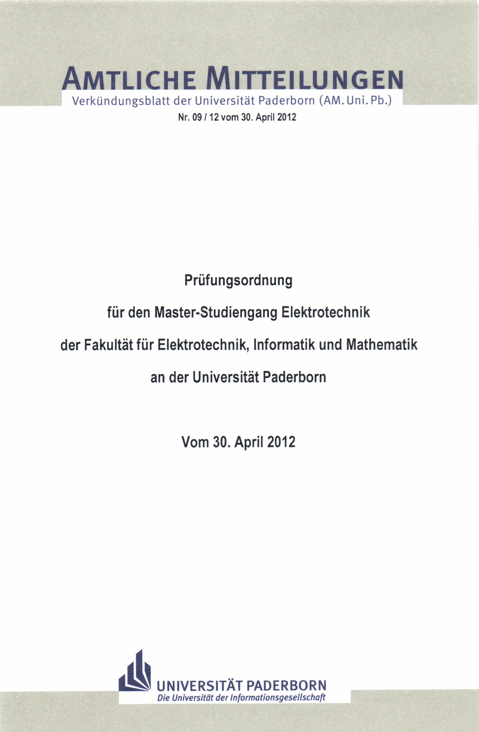 Prüfungsordnung für den Master-Studiengang Elektrotechnik der Fakultät für Elektrotechnik, Informatik und Mathematik an der Universität Paderborn : vom 30. April 2012