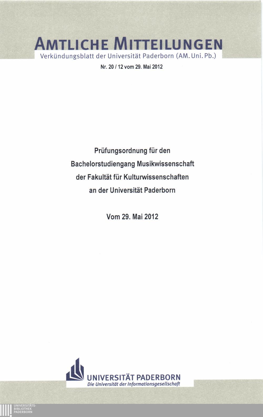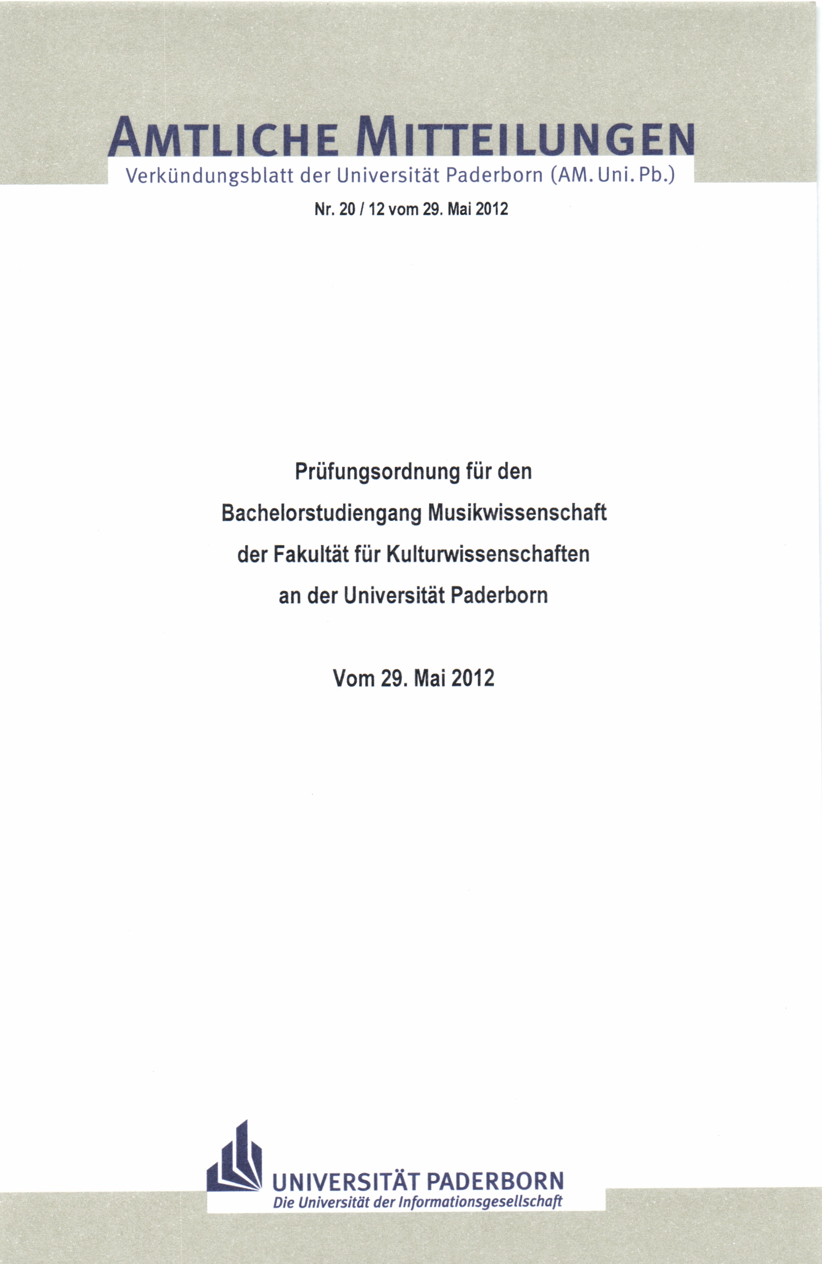 Prüfungsordnung für den Bachelorstudiengang Musikwissenschaft der Fakultät für Kulturwissenschaften an der Universität Paderborn : vom 29. Mai 2012