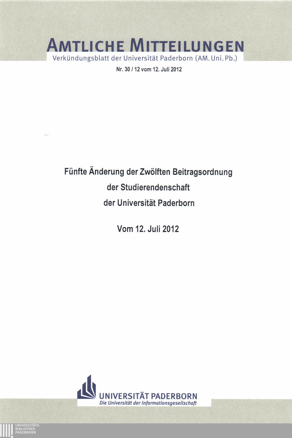 Fünfte Änderung der zwölften Beitragsordnung der Studierendenschaft der Universität Paderborn : vom 12. Juli 2012
