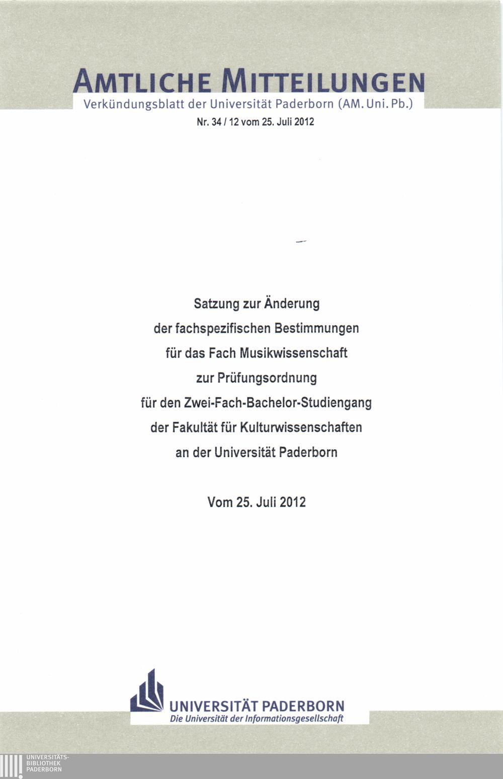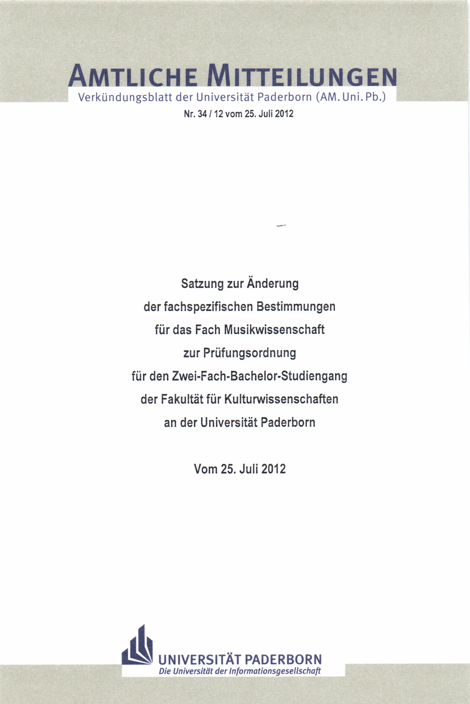 Satzung zur Änderung der fachspezifischen Bestimmungen für das Fach Musikwissenschaft zur Prüfungsordnung für den Zwei-Fach-Bachelor-Studiengang der Fakultät für Kulturwissenschaften an der Universität Paderborn : vom 25. Juli 2012