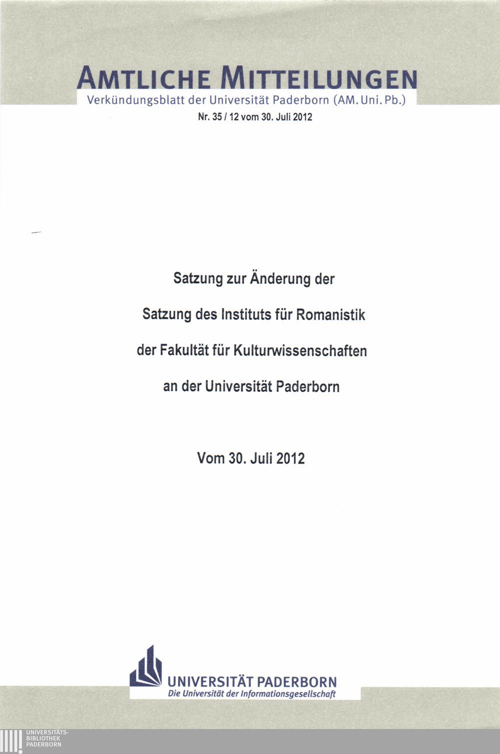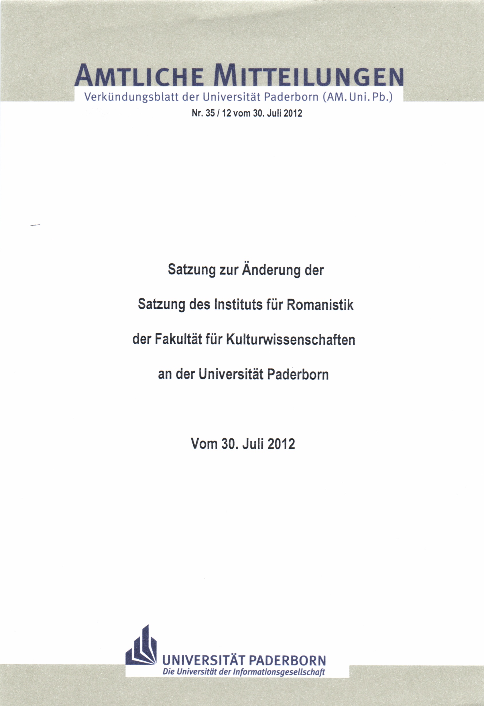 Satzung zur Änderung der Satzung des Instituts für Romanistik der Fakultät für Kulturwissenschaften an der Universität Paderborn : vom 30. Juli 2012