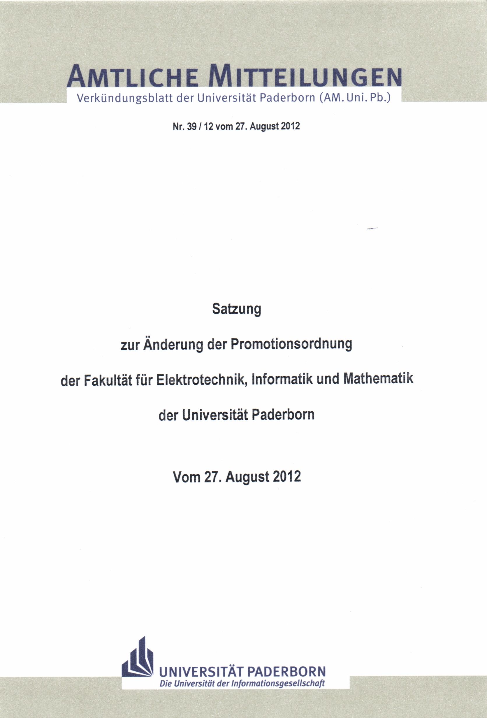Satzung zur Änderung der Promotionsordnung der Fakultät für Elektrotechnik, Informatik und Mathematik der Universität Paderborn : vom 27. August 2012
