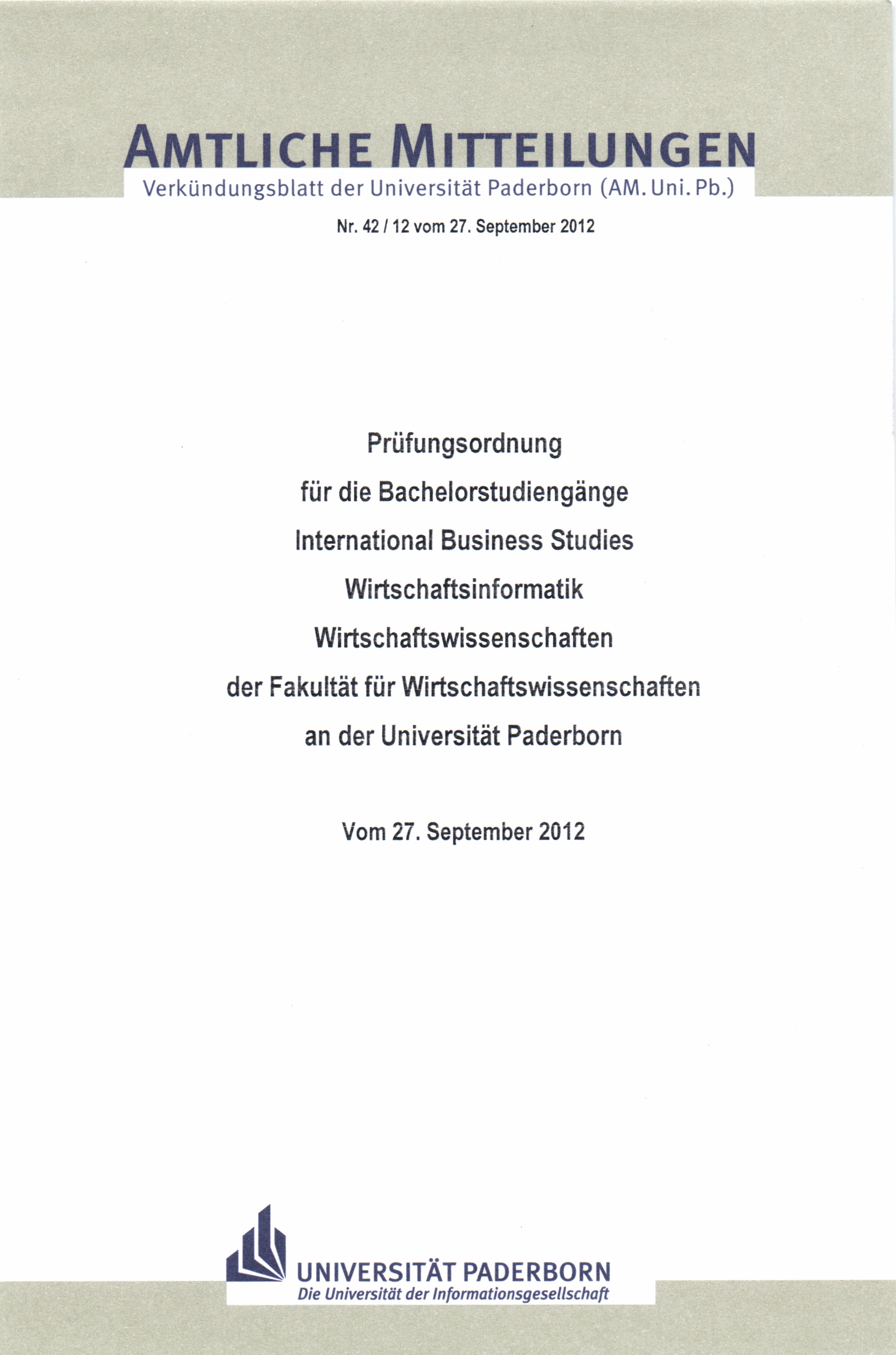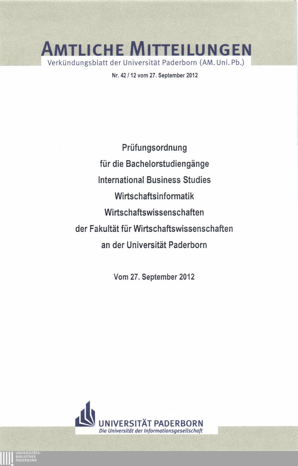 Prüfungsordnung für die Bachelorstudiengänge International Business Studies, Wirtschaftsinformatik, Wirtschaftswissenschaften der Fakultät für Wirtschaftswissenschaften an der Universität Paderborn : vom 27. September 2012