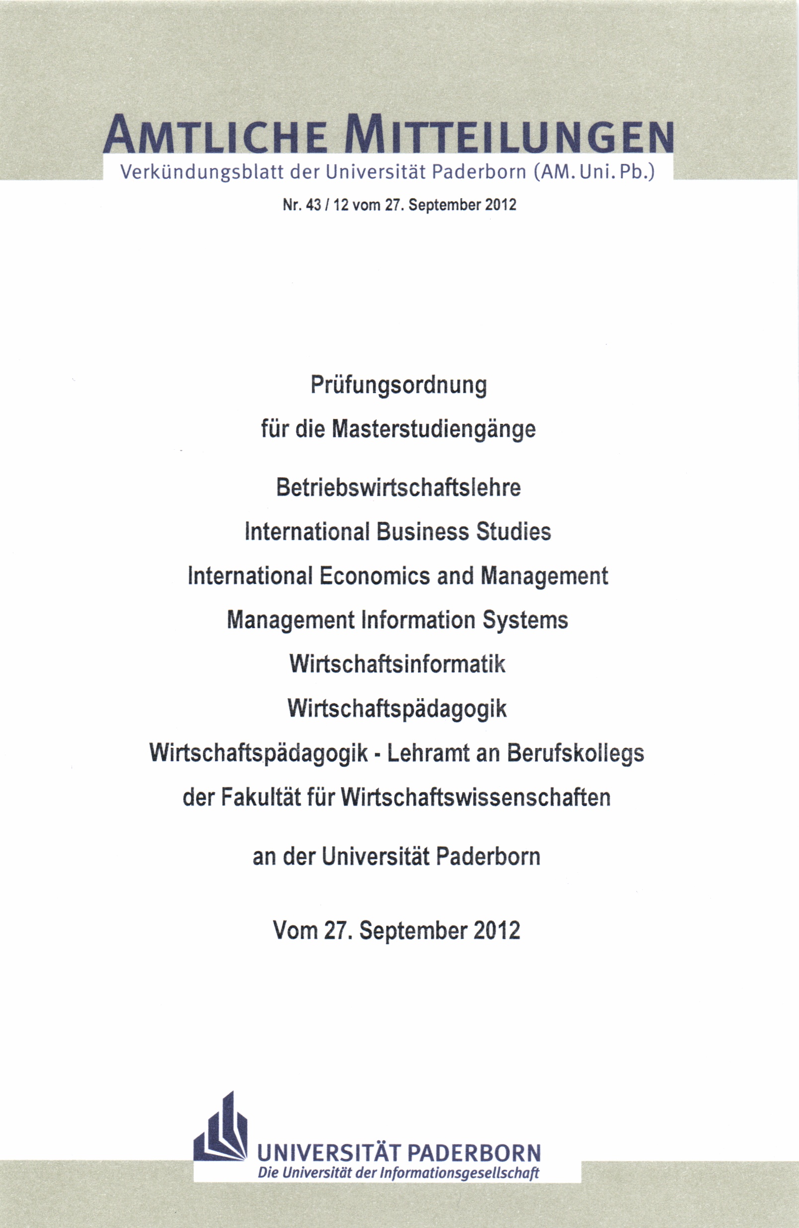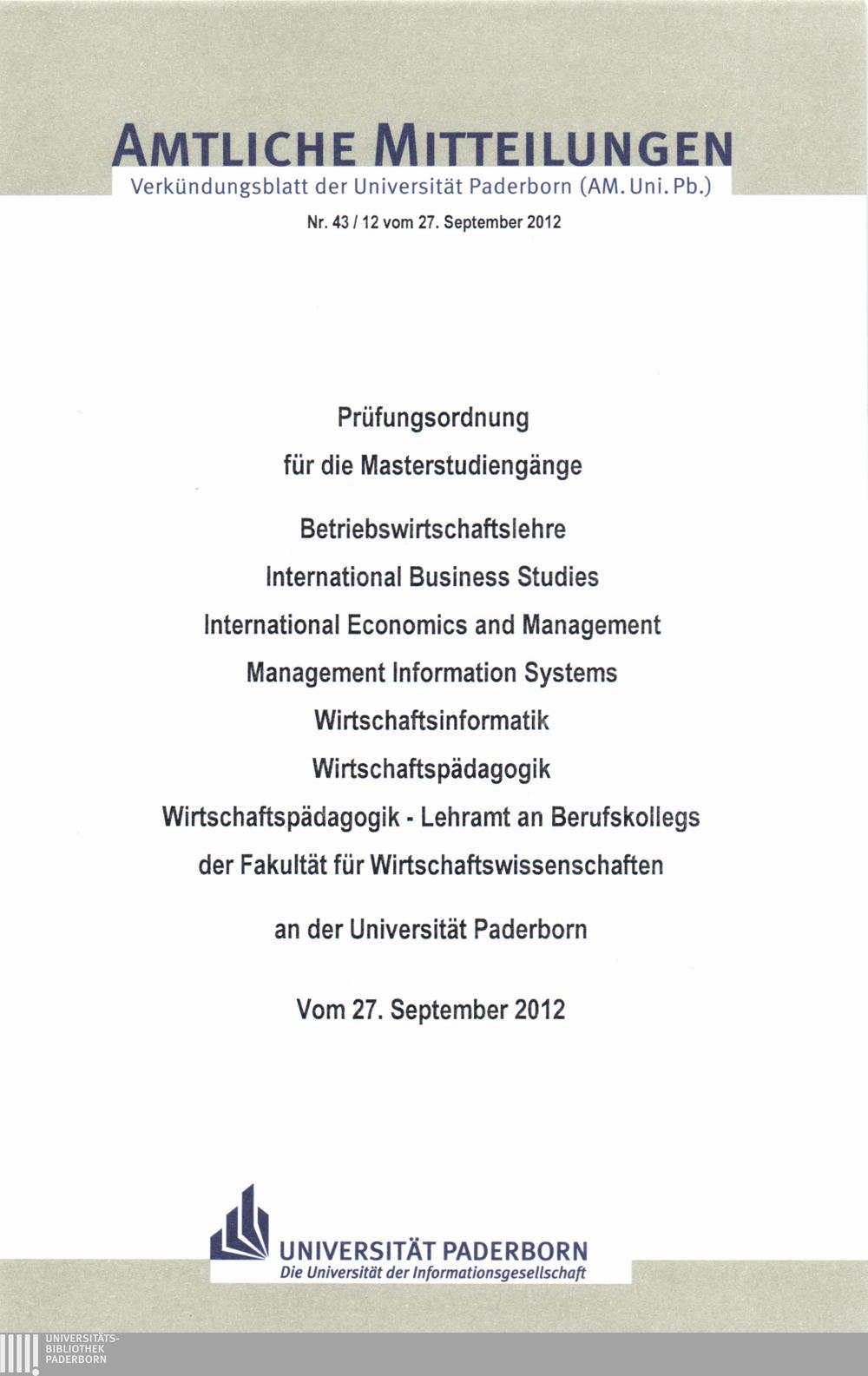 Prüfungsordnung für die Masterstudiengänge Betriebswirtschaftslehre, International Business Studies, International Economics and Management, Management Information Systems, Wirtschaftsinformatik, Wirtschaftspädagogik, Wirtschaftspädagogik - Lehramt an Berufskollegs, der Fakultät für Wirtschaftswissenschaften an der Universität Paderborn : vom 27. September 2012