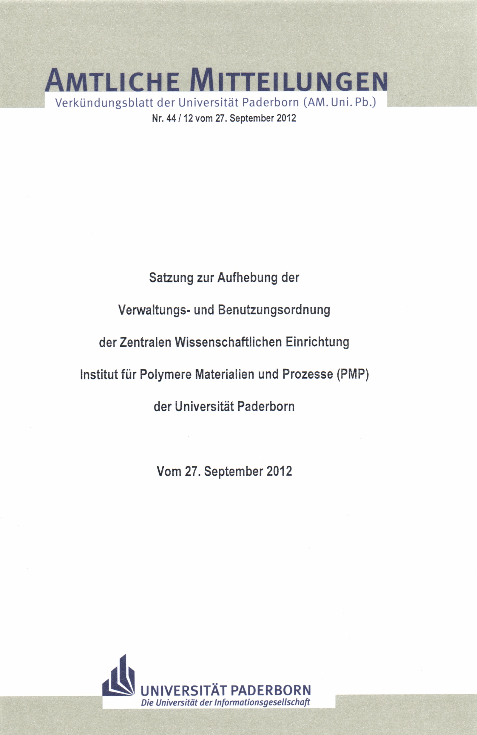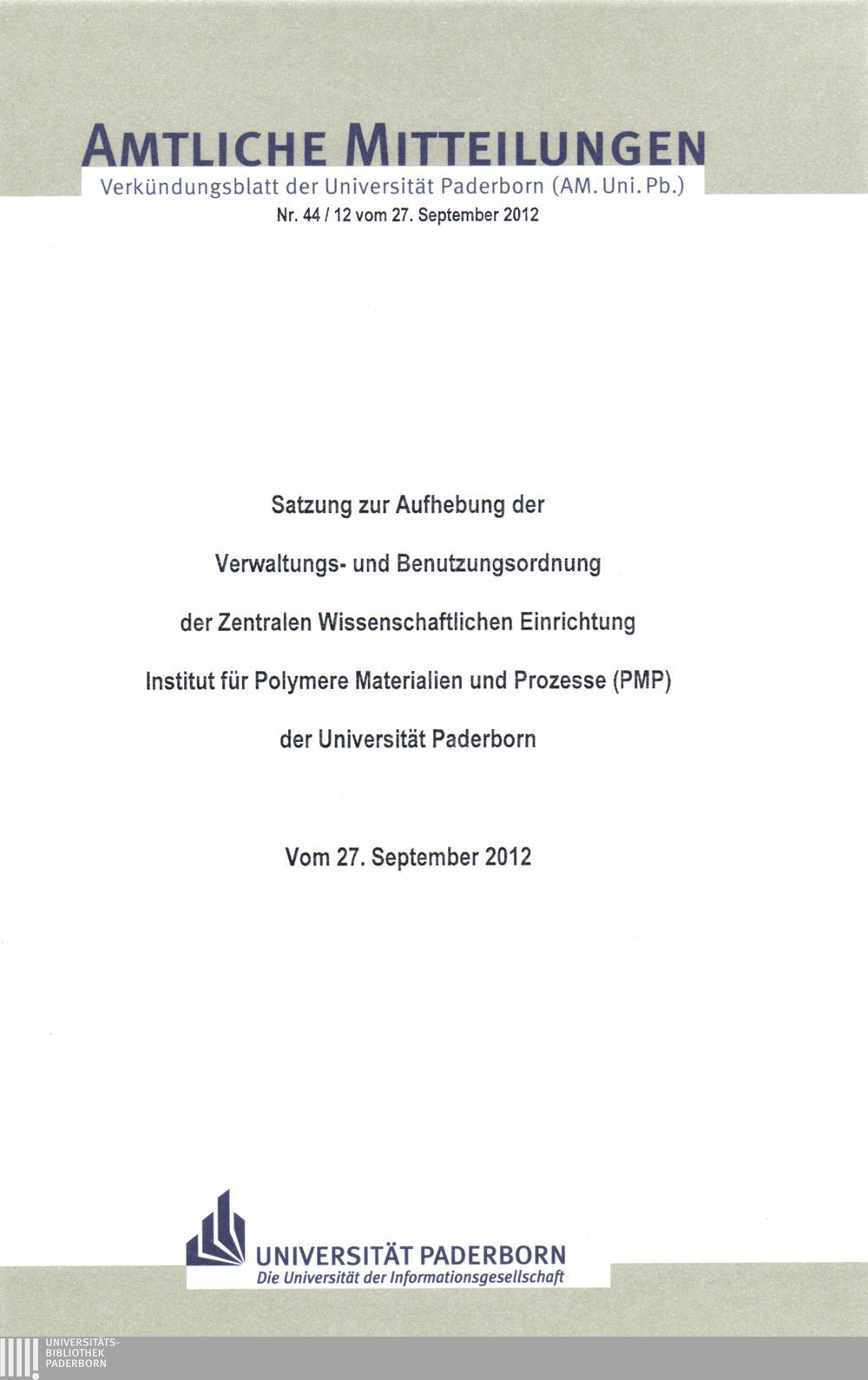 Satzung zur Aufhebung der Verwaltungs- und Benutzungsordnung der Zentralen Wissenschaftlichen Einrichtung Institut für Polymere Materialien und Prozesse (PMP) der Universität Paderborn : vom 27. September 2012