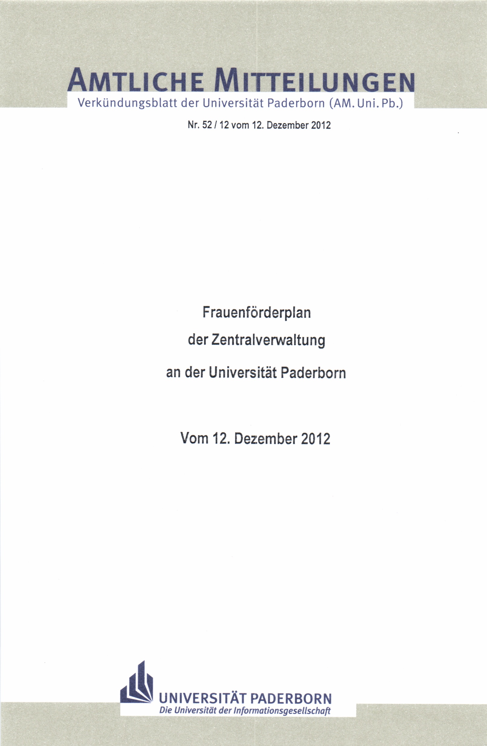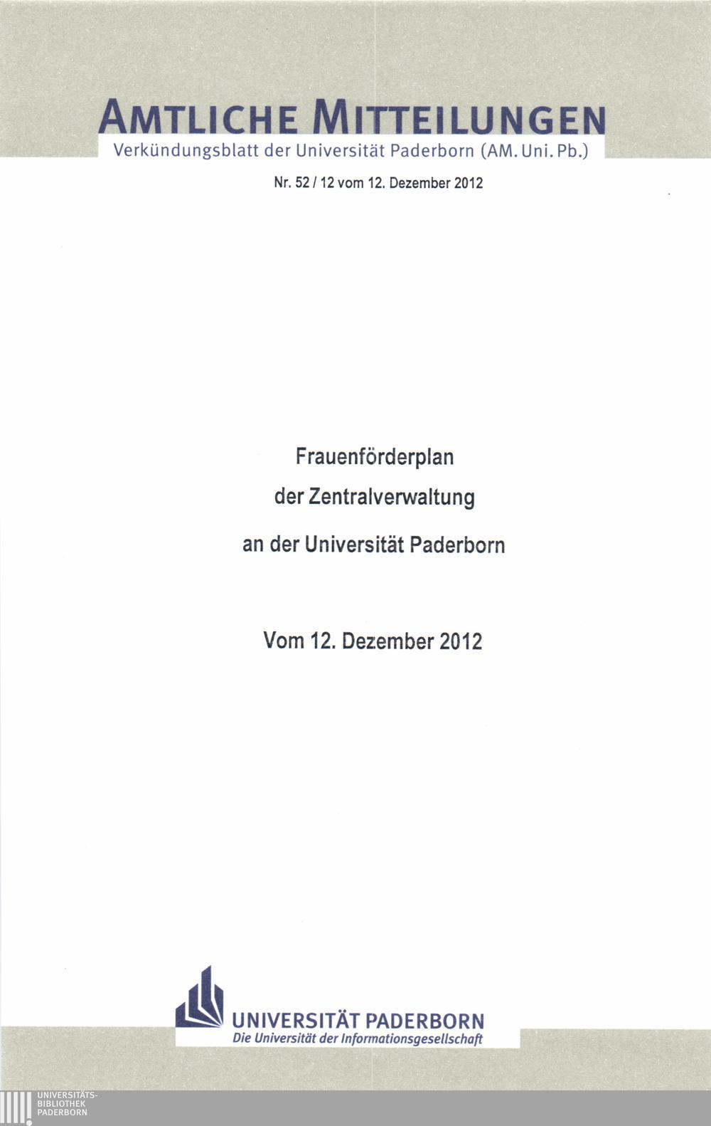 Frauenförderplan der Zentralverwaltung an der Universität Paderborn : vom 12. Dezember 2012