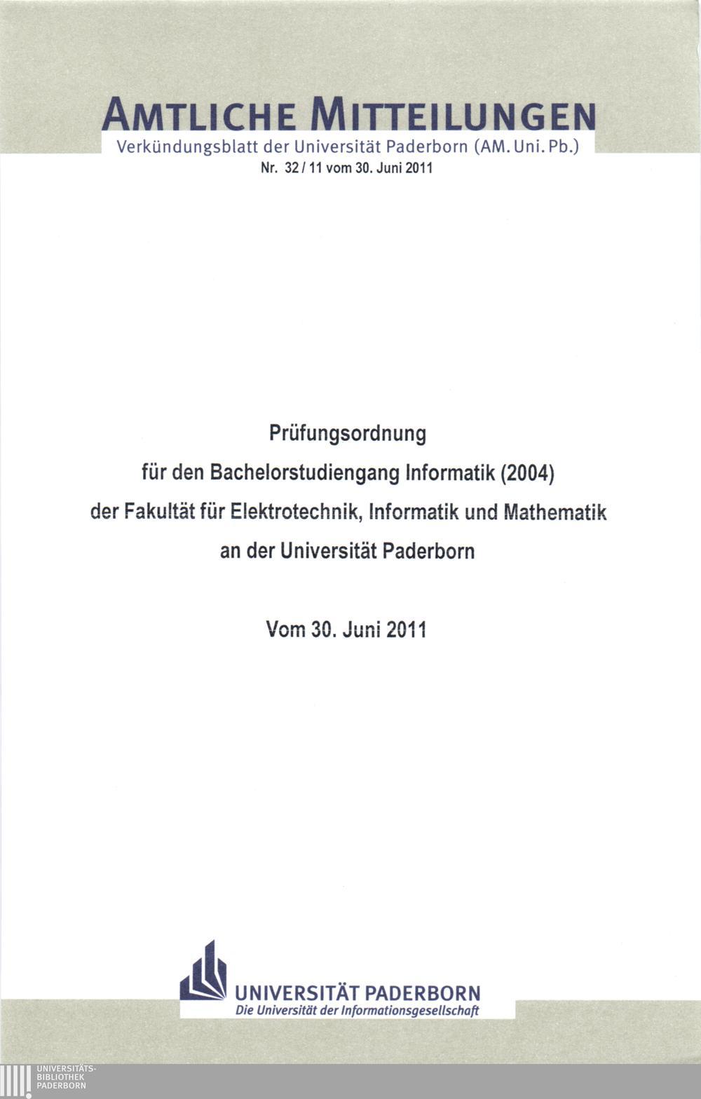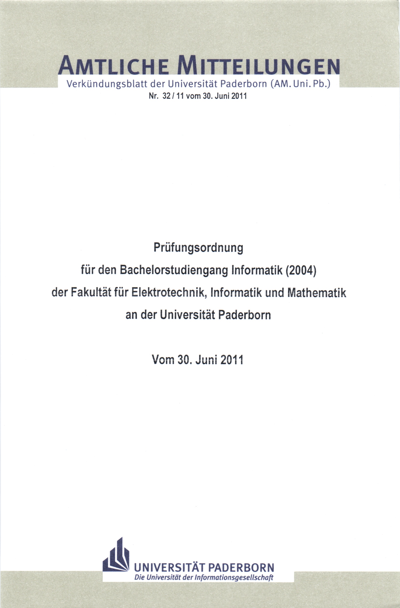 Prüfungsordnung für den Bachelorstudiengang Informatik (2004) der Fakultät für Elektrotechnik, Informatik und Mathematik an der Universität Paderborn : vom 30. Juni 2011