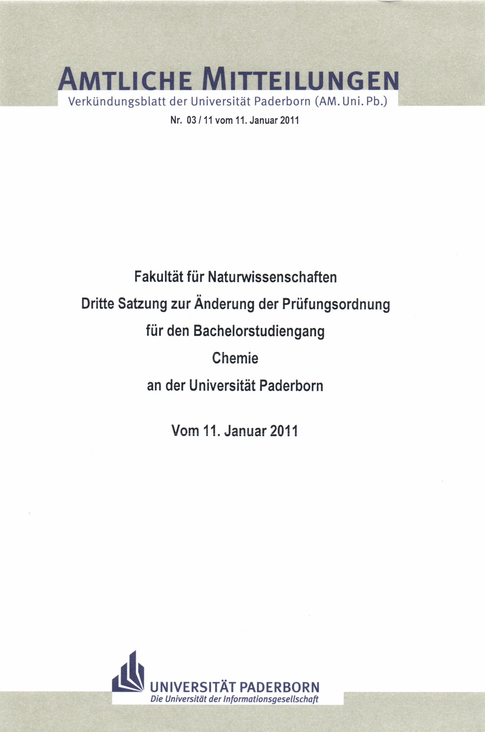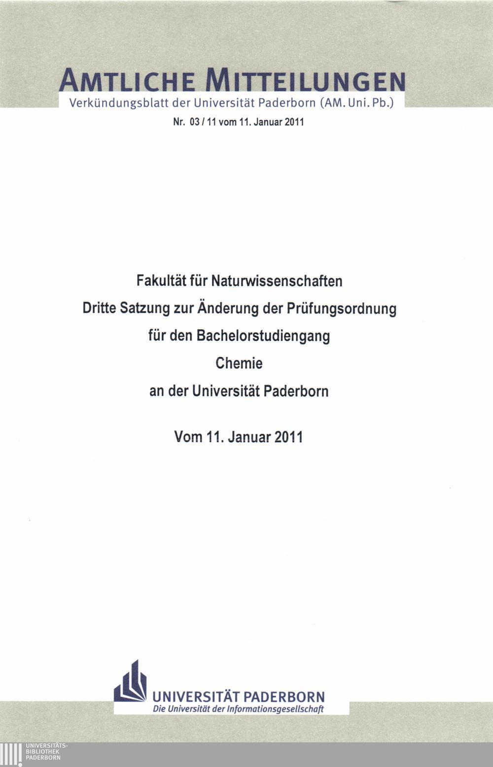 Dritte Satzung zur Änderung der Prüfungsordnung für den Bachelorstudiengang Chemie an der Universität Paderborn : vom 11. Januar 2011 / Fakultät für Naturwissenschaften
