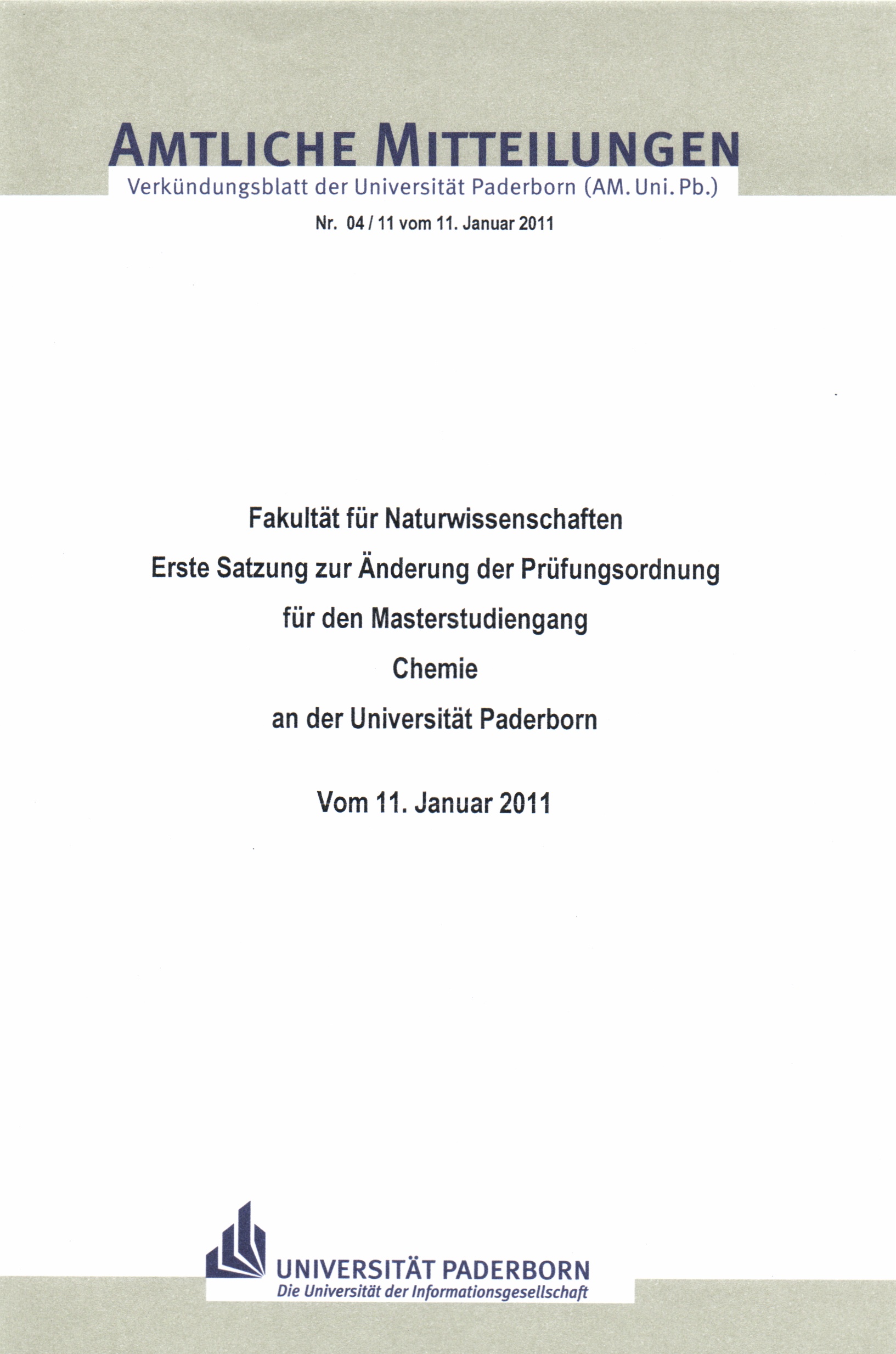 Erste Satzung zur Änderung der Prüfungsordnung für den Masterstudiengang Chemie an der Universität Paderborn : vom 11. Januar 2011 / Fakultät für Naturwissenschaften