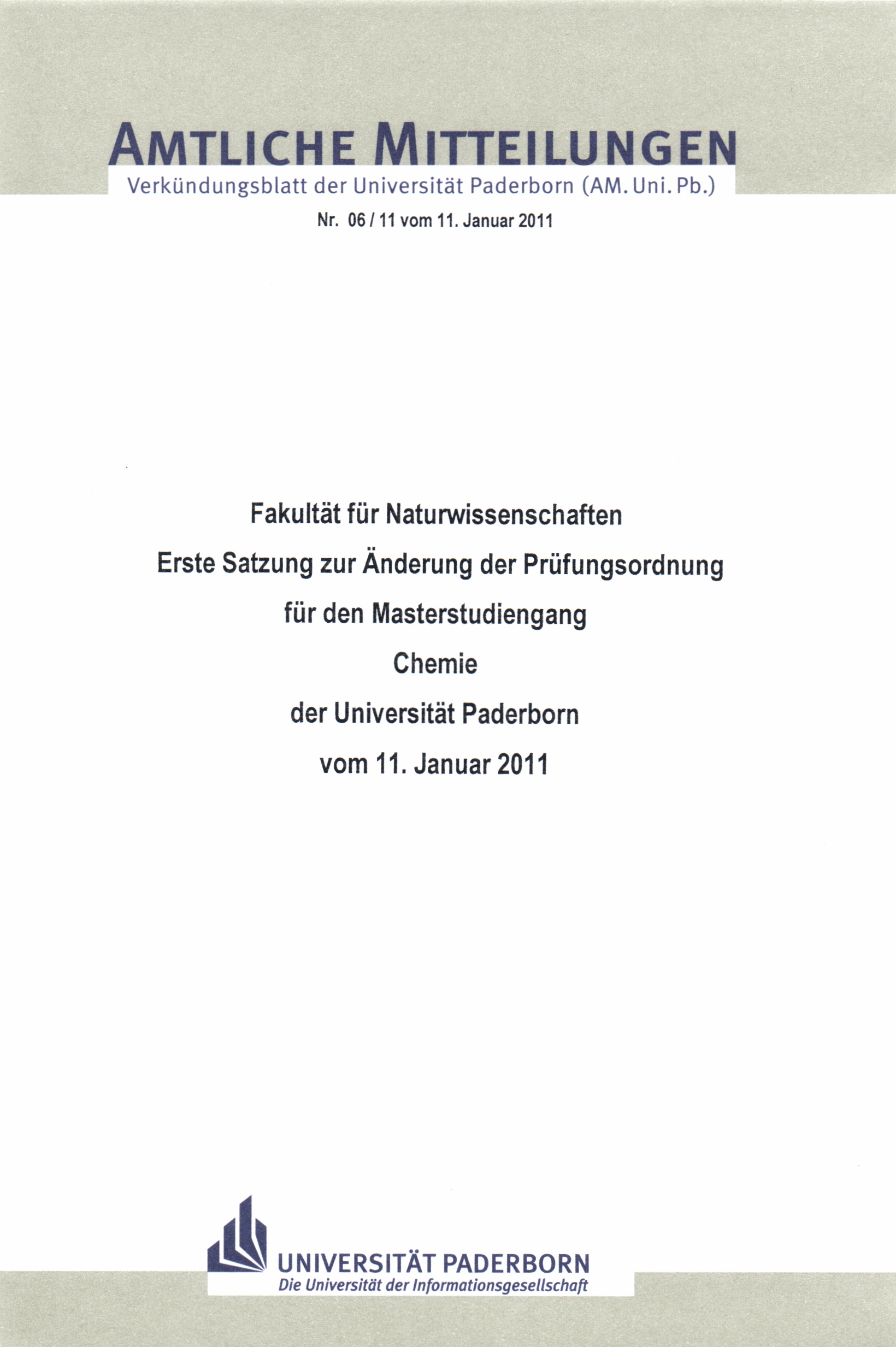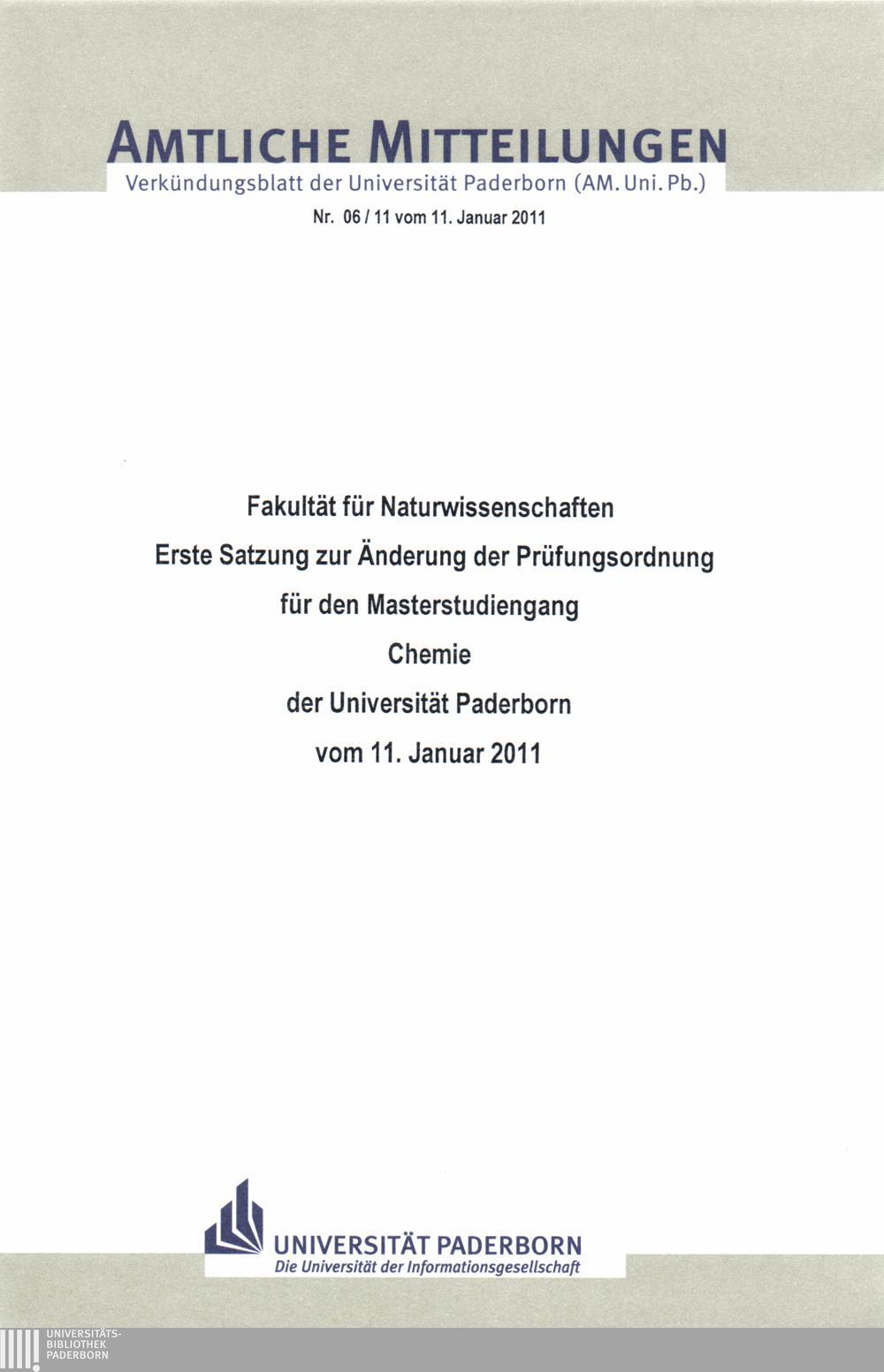 Erste Satzung zur Änderung der Prüfungsordnung für den Masterstudiengang Chemie der Universität Paderborn : vom 11. Januar 2011 / Fakultät für Naturwissenschaften