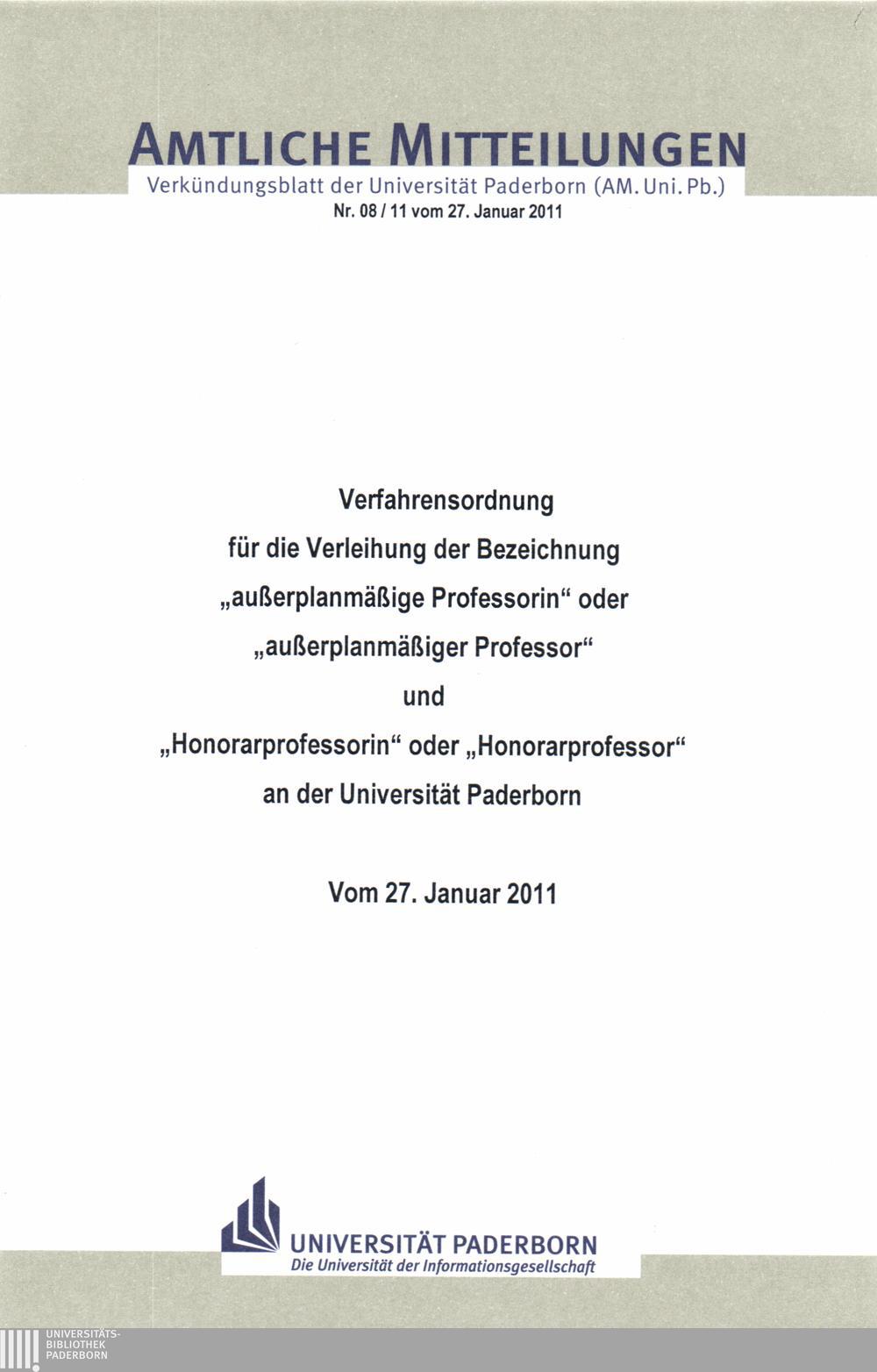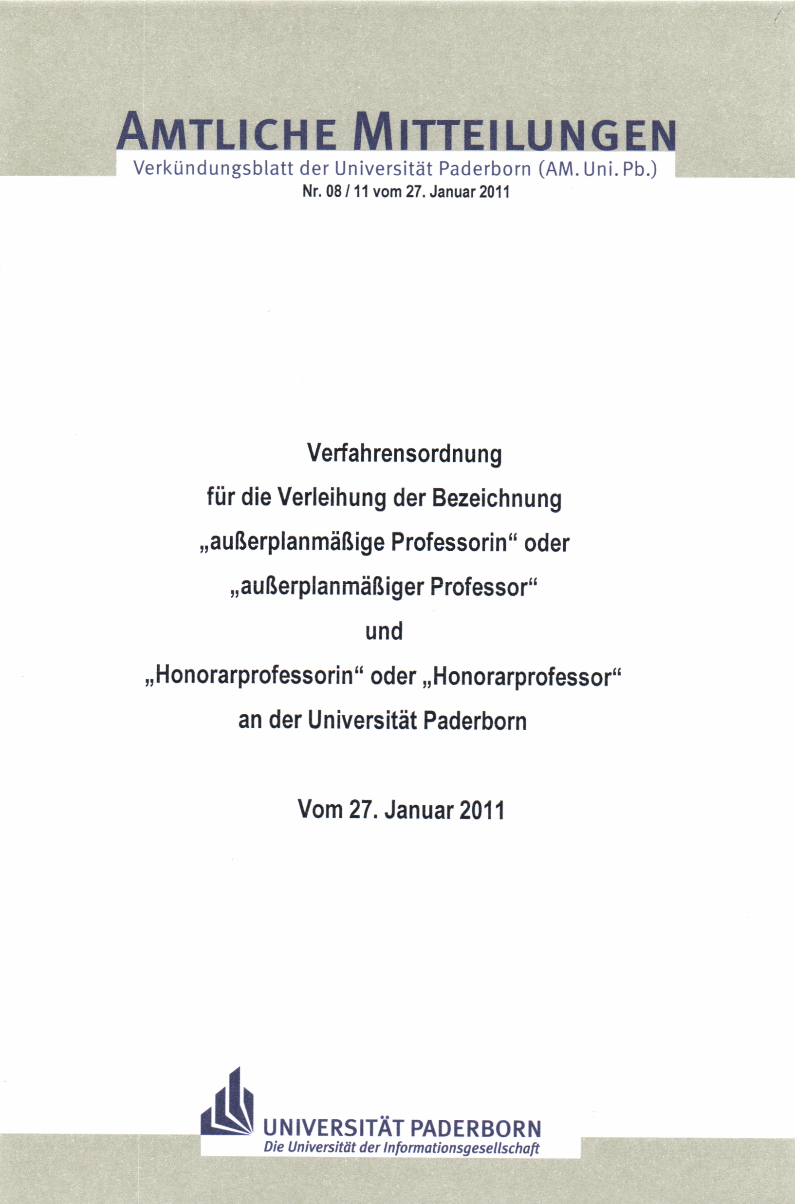 Verfahrensordnung für die Verleihung der Bezeichnung "außerplanmäßige Professorin" oder "außerplanmäßiger Professor" und "Honorarprofessorin" oder "Honorarprofessor" an der Universität Paderborn : vom 27. Januar 2011