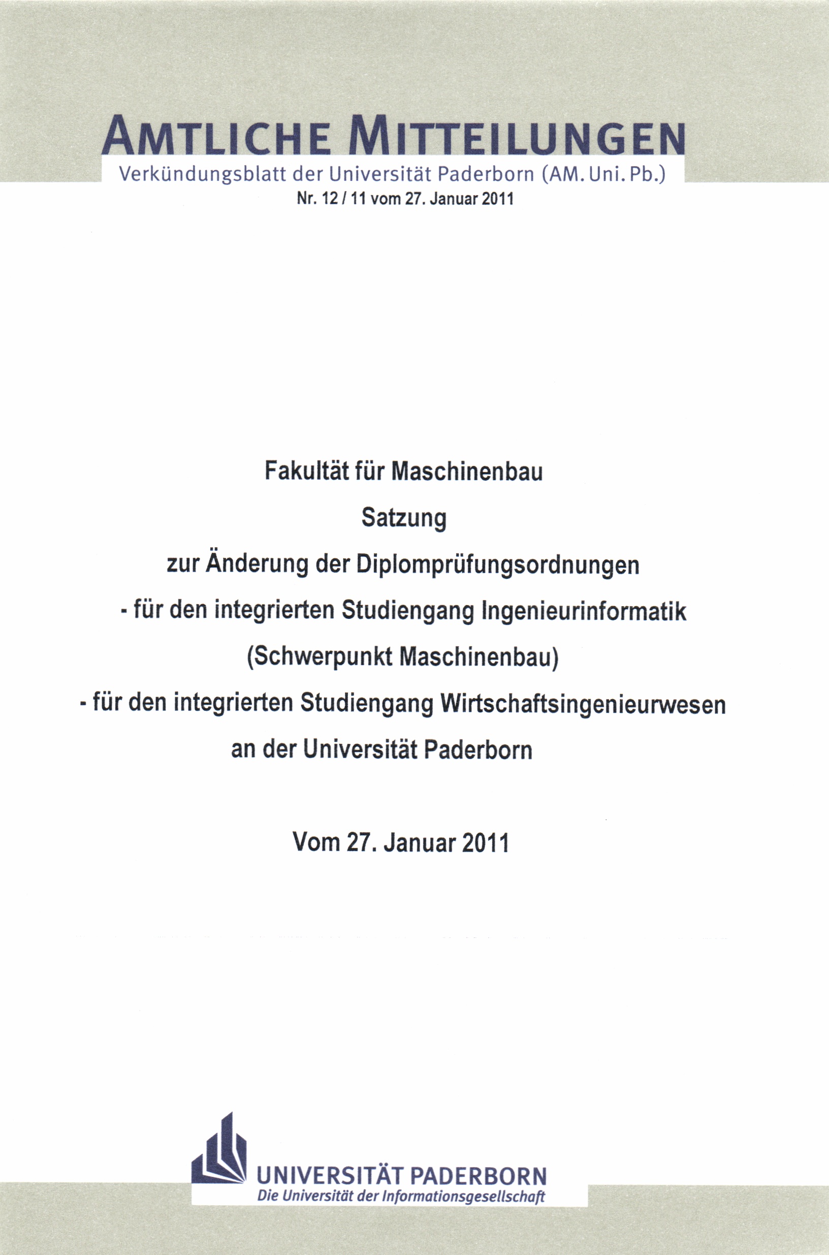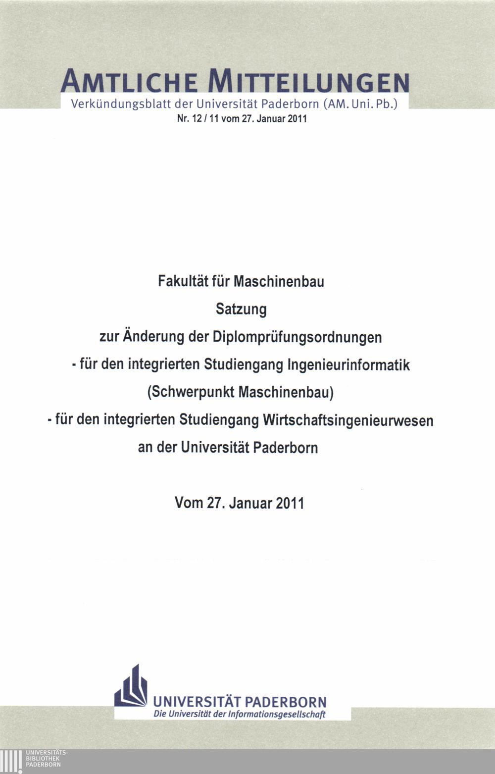 Satzung zur Änderung der Diplomprüfungsordnungen, - für den integrierten Studiengang Ingenieurinformatik (Schwerpunkt Maschinenbau), - für den integrierten Studiengang Wirtschaftsingenieurwesen an der Universität Paderborn : vom 27. Januar 2011 / Fakultät für Maschinenbau
