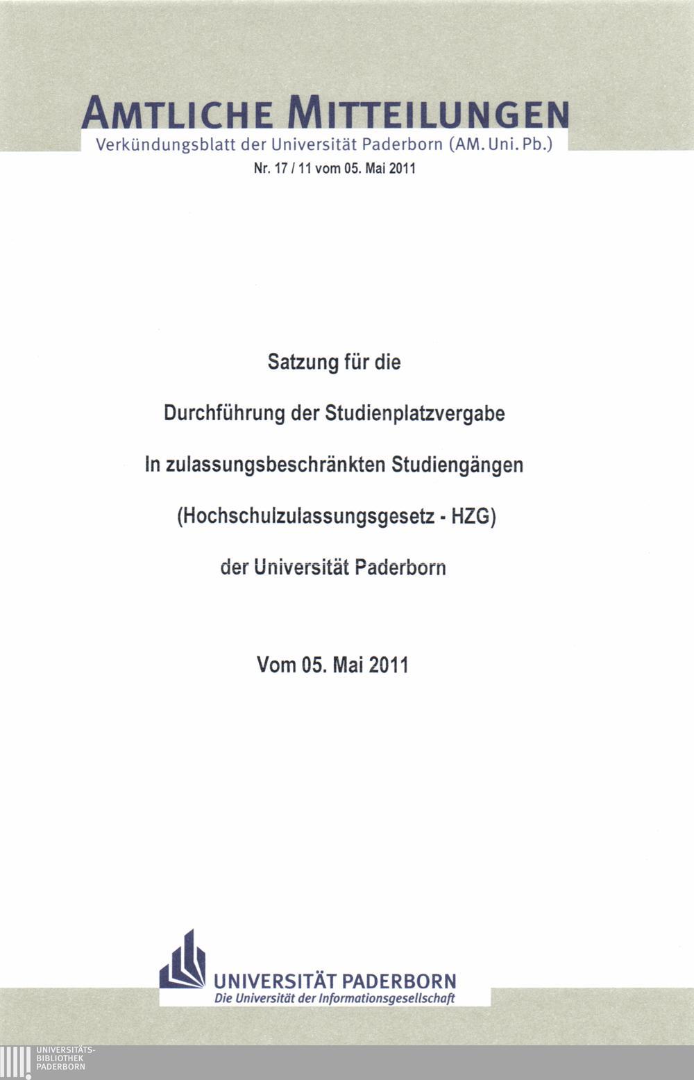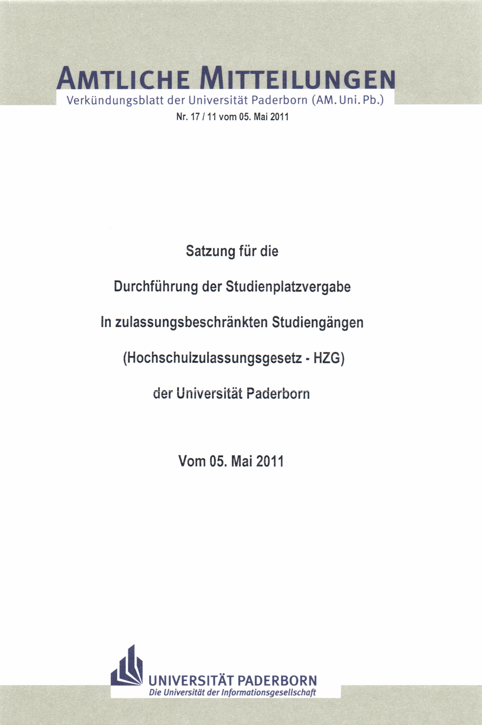 Satzung für die Durchführung der Studienplatzvergabe in zulassungsbeschränkten Studiengängen (Hochschulzulassungsgesetz) der Universität Paderborn : vom 05. Mai 2011