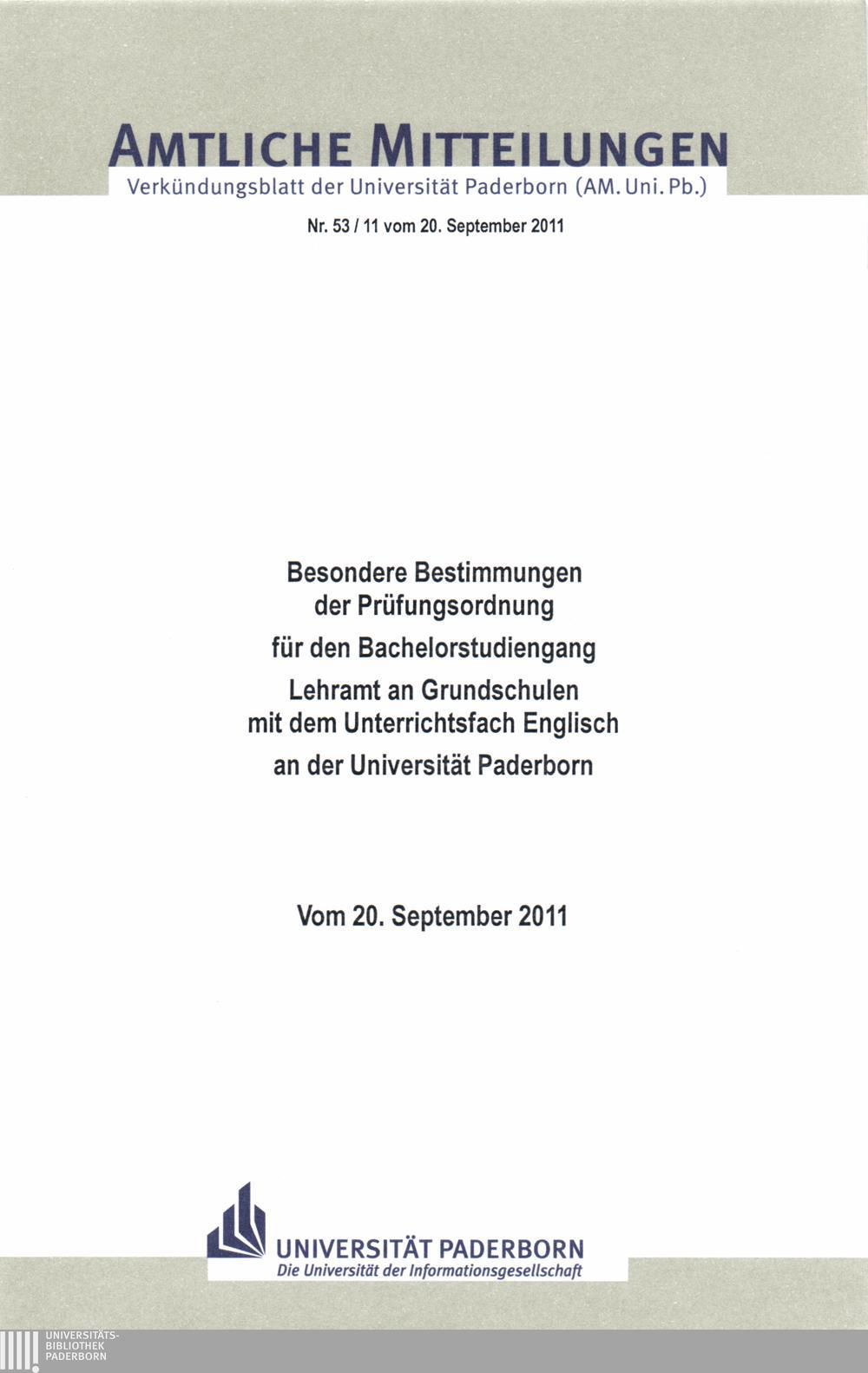 Besondere Bestimmungen der Prüfungsordnung für den Bachelorstudiengang Lehramt an Grundschulen mit dem Unterrichtsfach Englisch an der Universität Paderborn : vom 20. September 2011