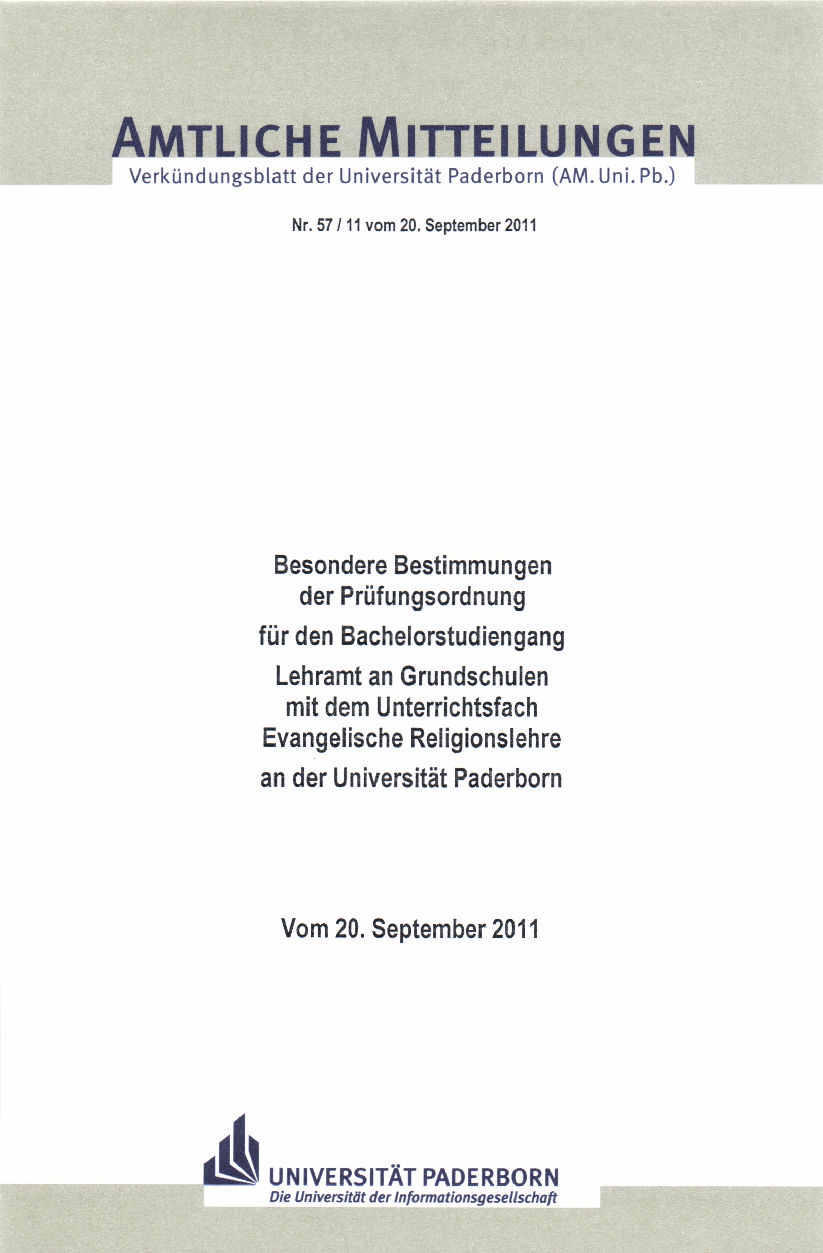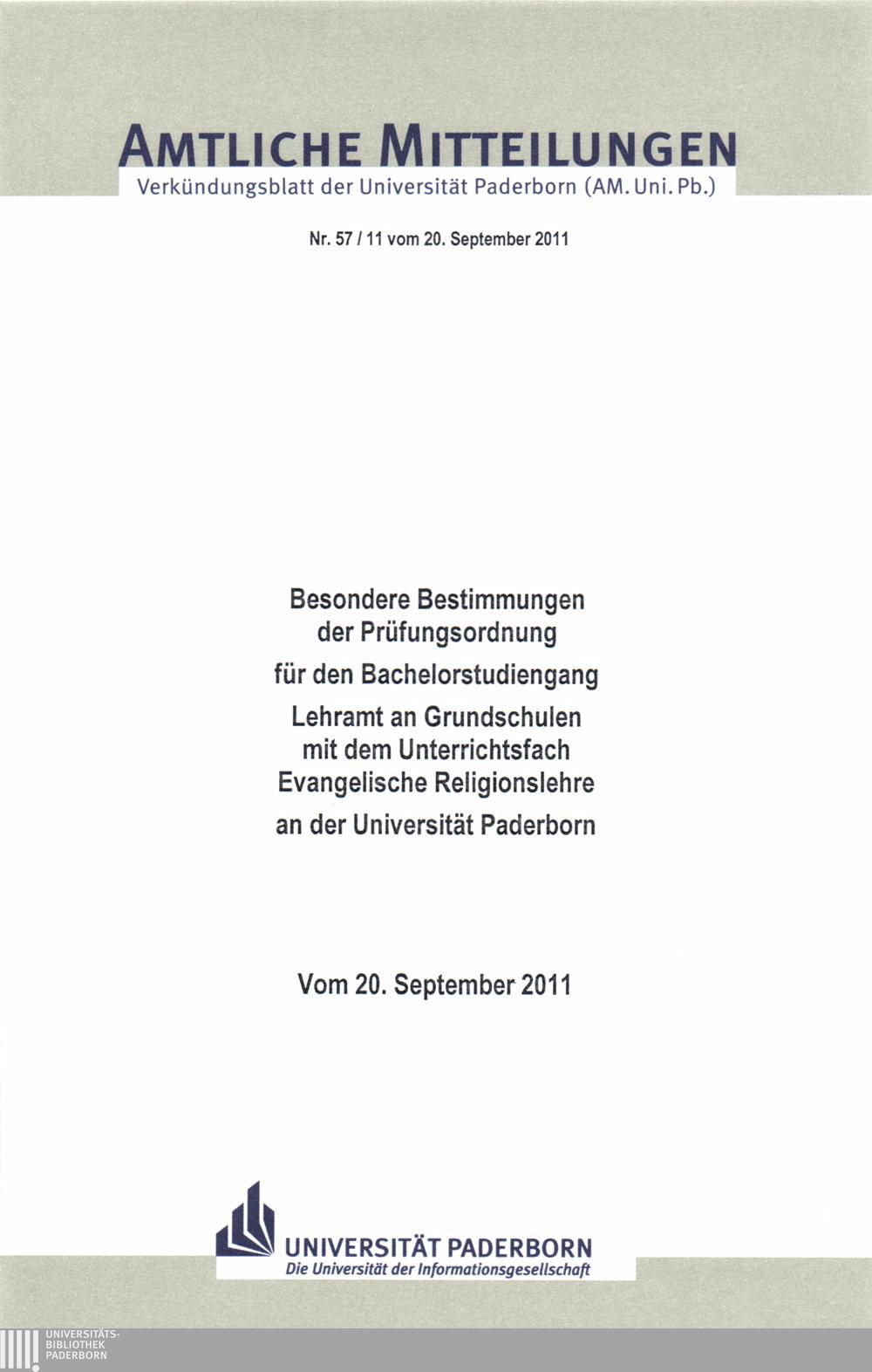 Besondere Bestimmungen der Prüfungsordnung für den Bachelorstudiengang Lehramt an Grundschulen mit dem Unterrichtsfach Evangelische Religionslehre an der Universität Paderborn : vom 20. September 2011