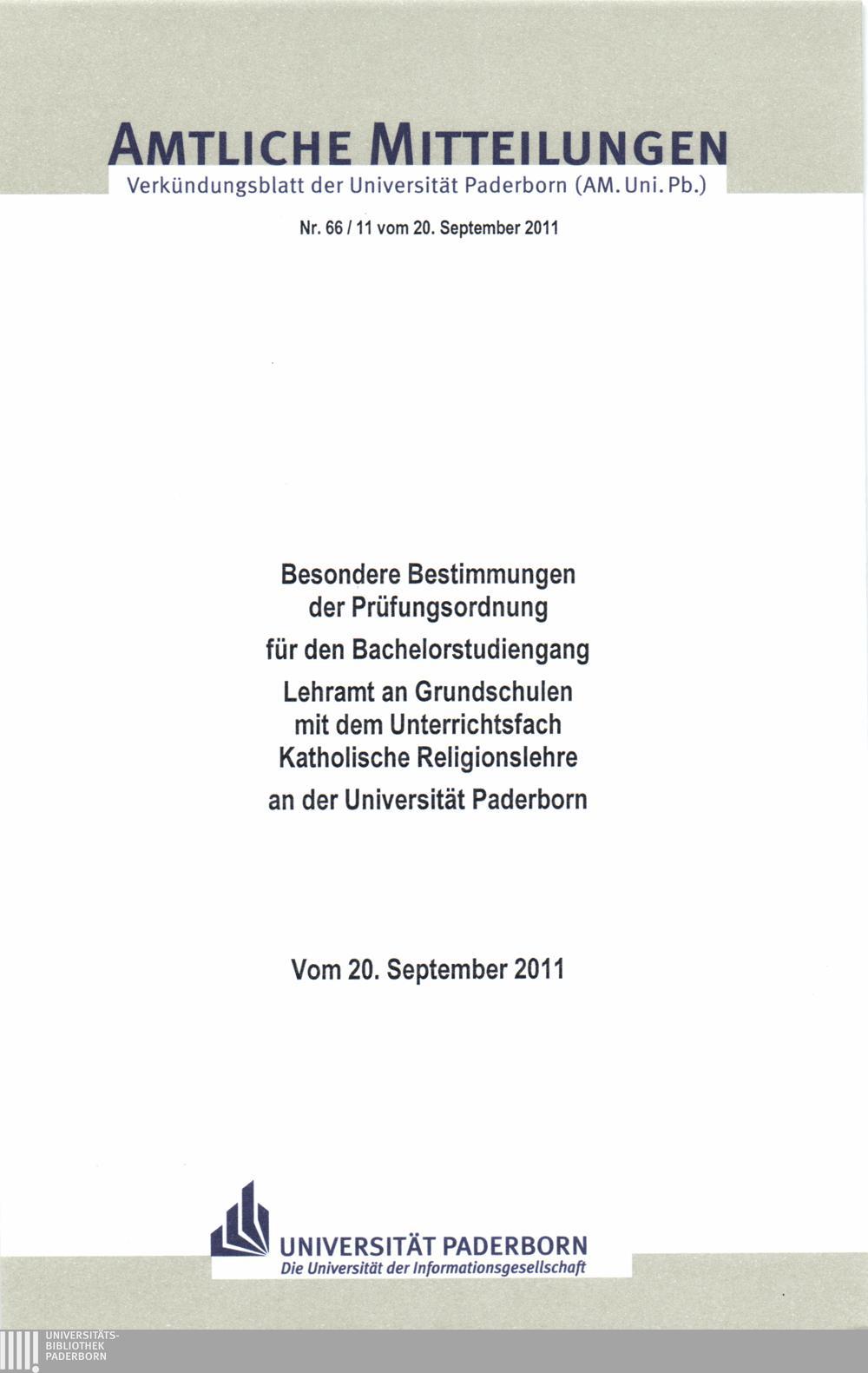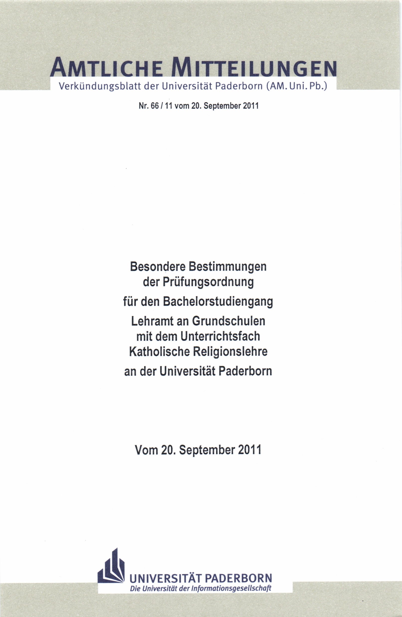 Besondere Bestimmungen der Prüfungsordnung für den Bachelorstudiengang Lehramt an Grundschulen mit dem Unterrichtsfach Katholische Religionslehre an der Universität Paderborn : vom 20. September 2011