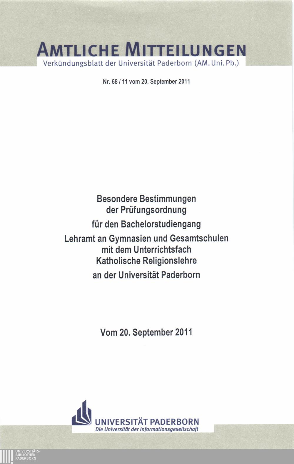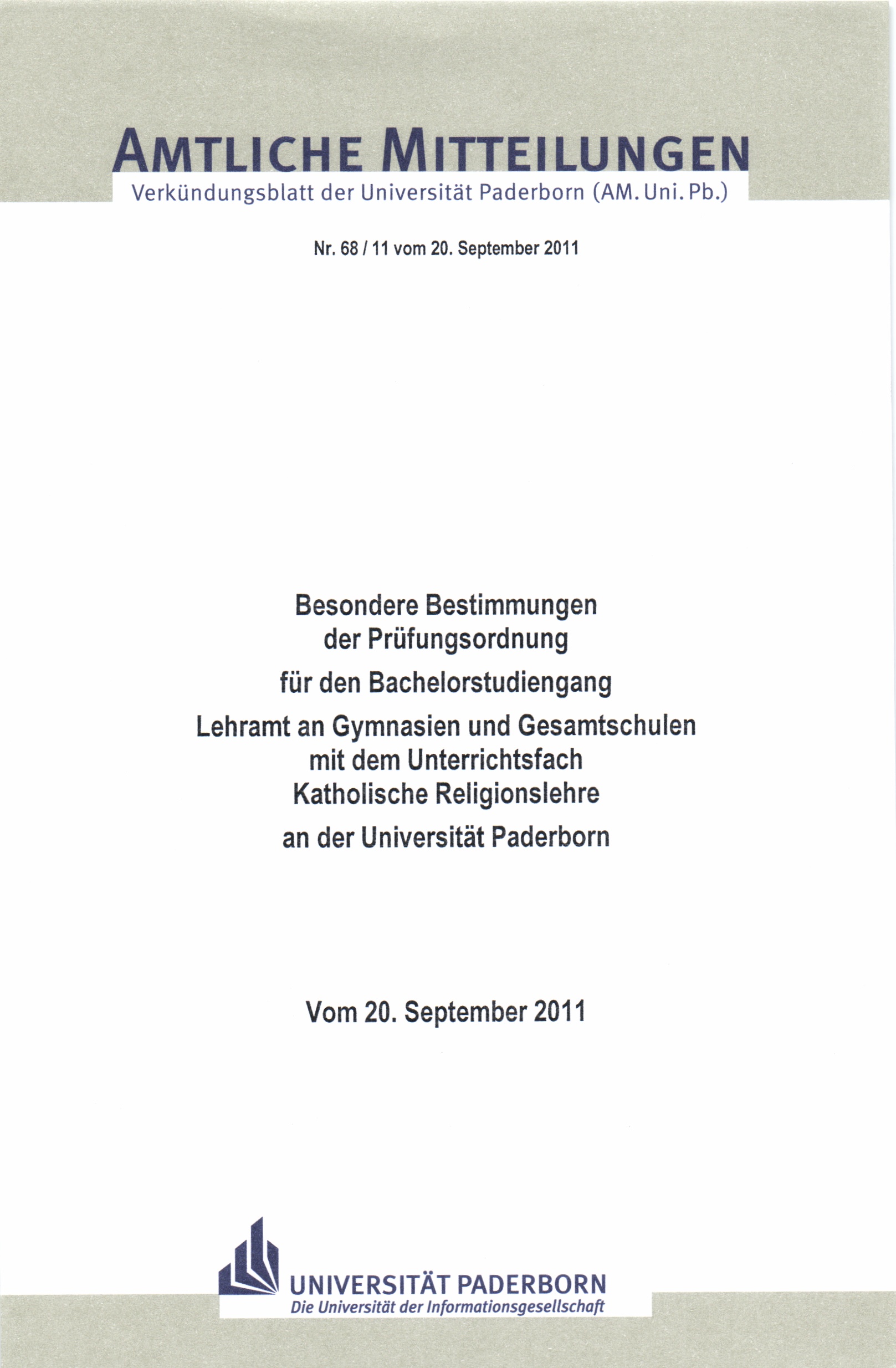 Besondere Bestimmungen der Prüfungsordnung für den Bachelorstudiengang Lehramt an Gymnasien und Gesamtschulen mit dem Unterrichtsfach Katholische Religionslehre an der Universität Paderborn : vom 20. September 2011