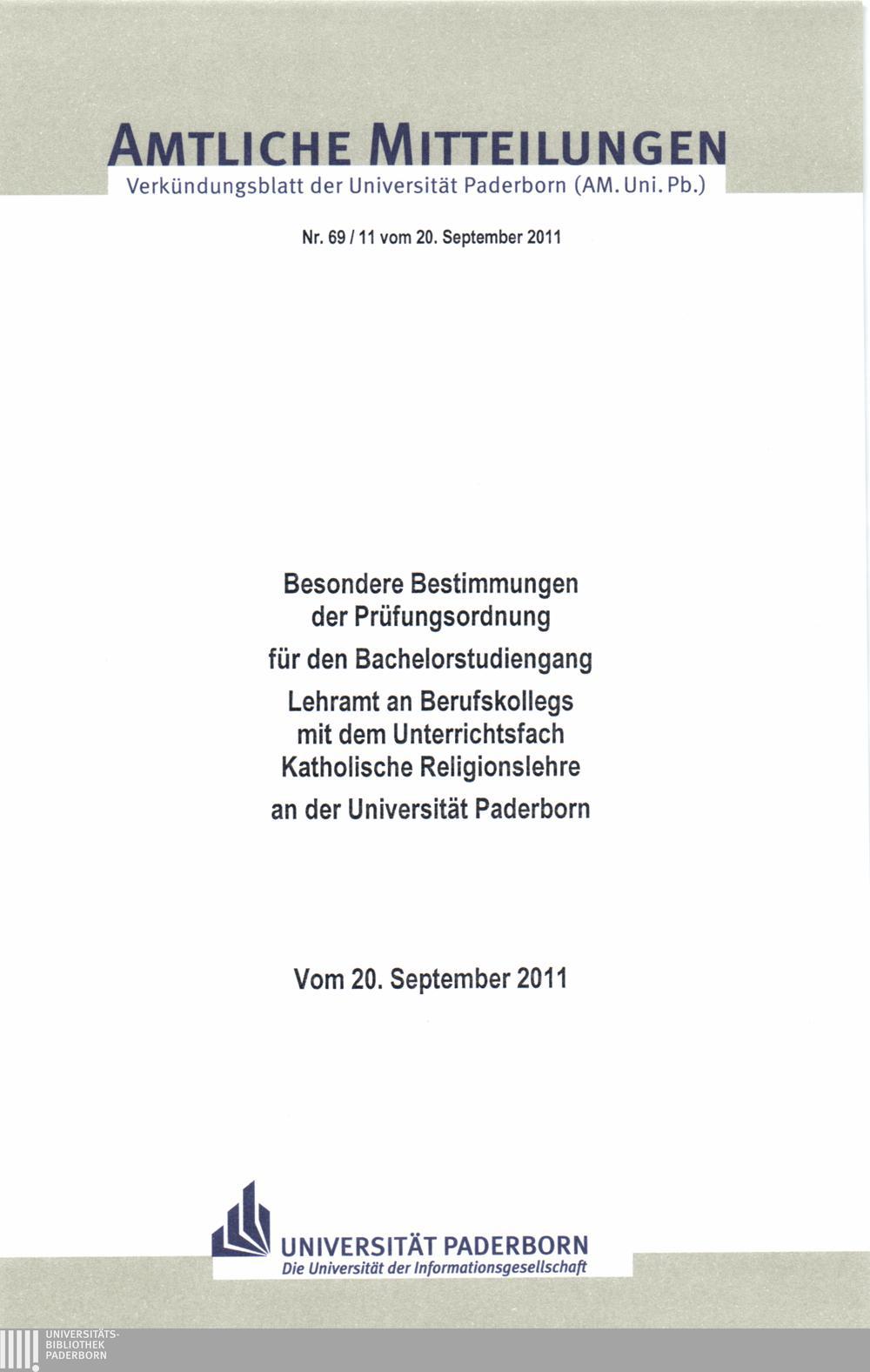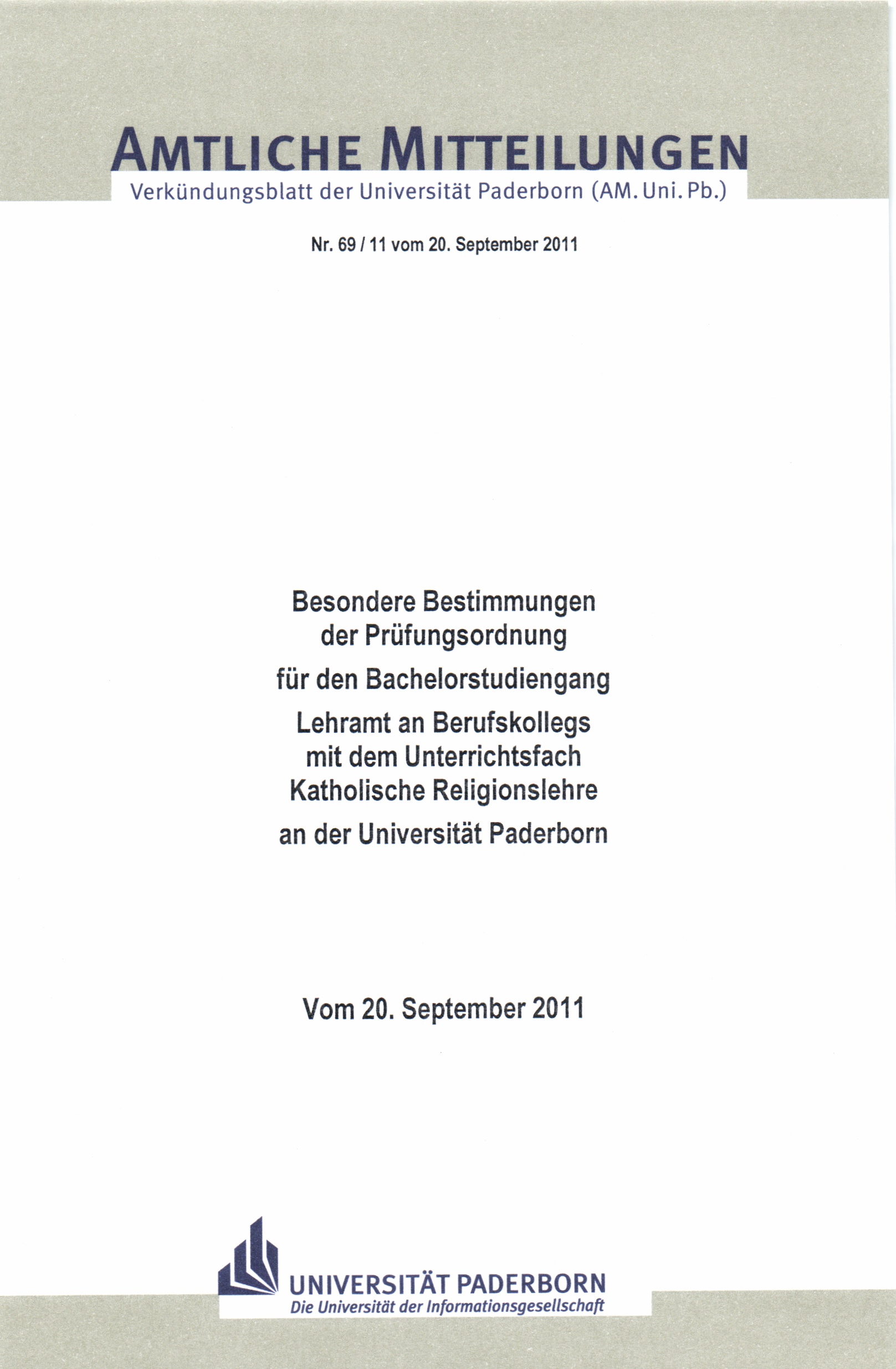 Besondere Bestimmungen der Prüfungsordnung für den Bachelorstudiengang Lehramt an Berufskollegs mit dem Unterrichtsfach Katholische Religionslehre an der Universität Paderborn : vom 20. September 2011