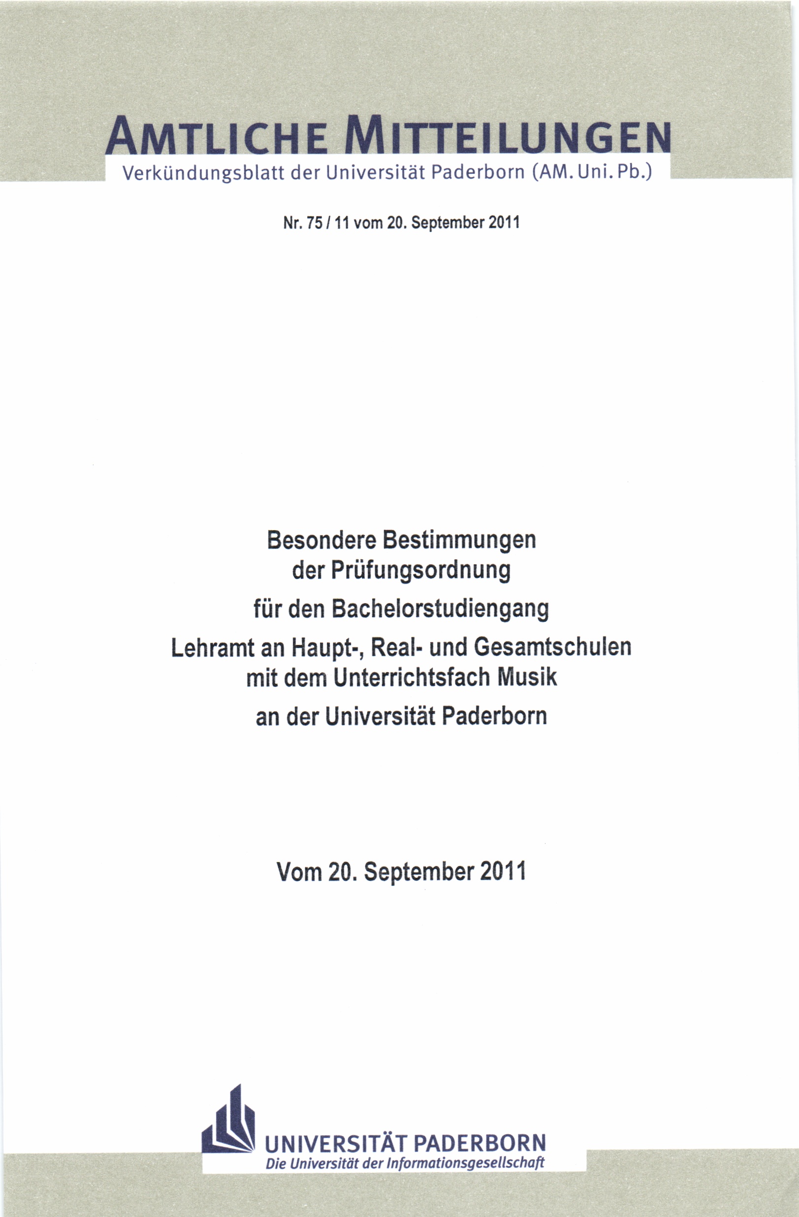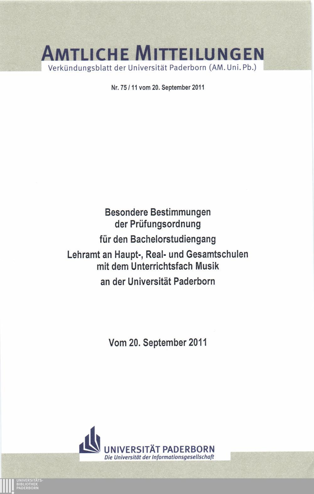 Besondere Bestimmungen der Prüfungsordnung für den Bachelorstudiengang Lehramt an Haupt-, Real- und Gesamtschulen mit dem Unterrichtsfach Musik an der Universität Paderborn : vom 20. September 2011