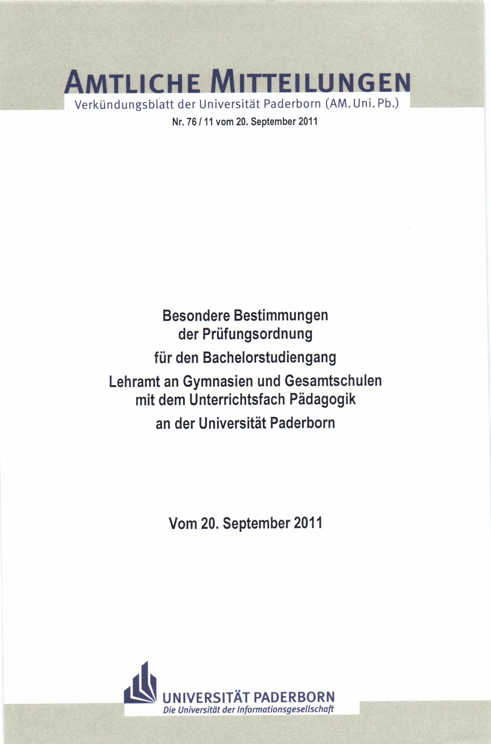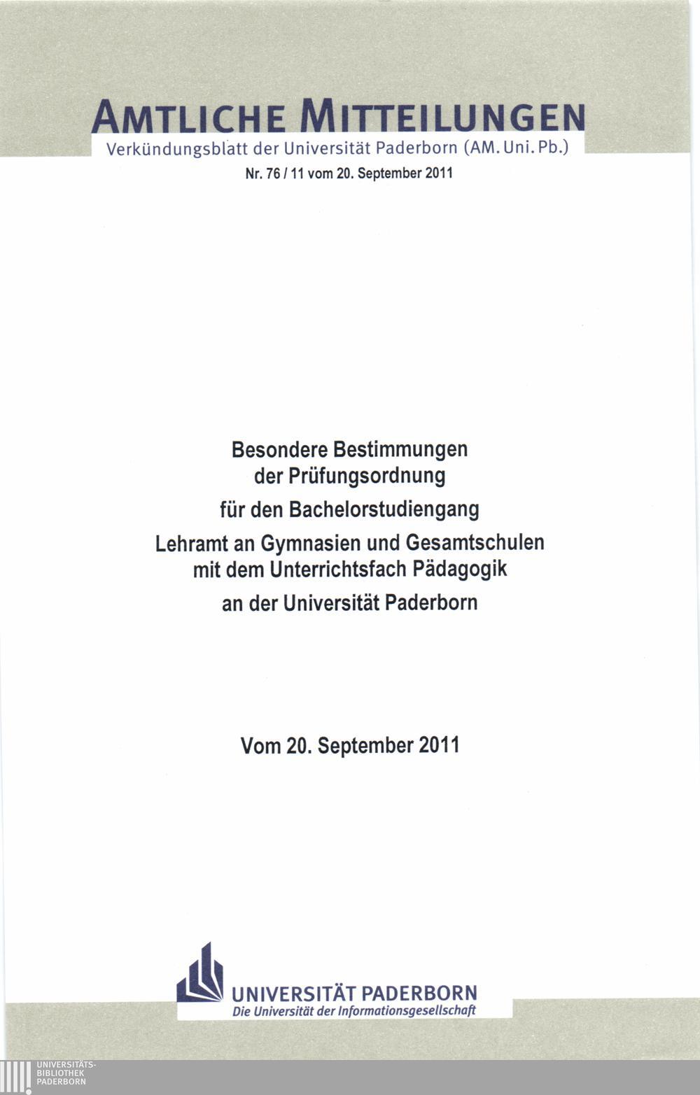 Besondere Bestimmungen der Prüfungsordnung für den Bachelorstudiengang Lehramt an Gymnasien und Gesamtschulen mit dem Unterrichtsfach Pädagogik an der Universität Paderborn : vom 20. September 2011