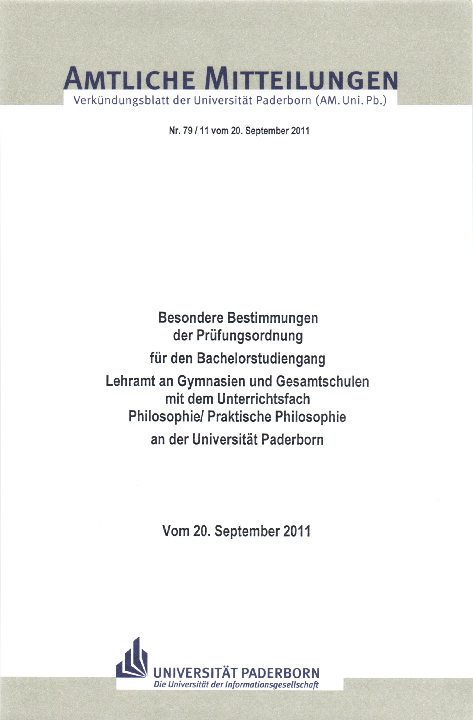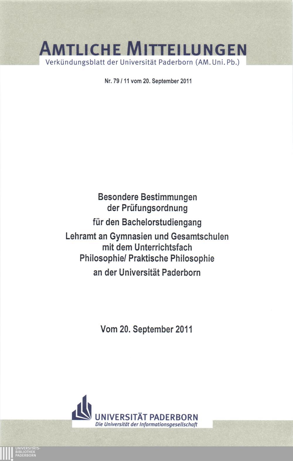 Besondere Bestimmungen der Prüfungsordnung für den Bachelorstudiengang Lehramt an Gymnasien und Gesamtschulen mit dem Unterrichtsfach Philosophie, Praktische Philosophie an der Universität Paderborn : vom 20. September 2011