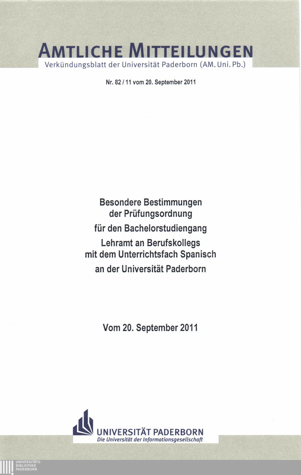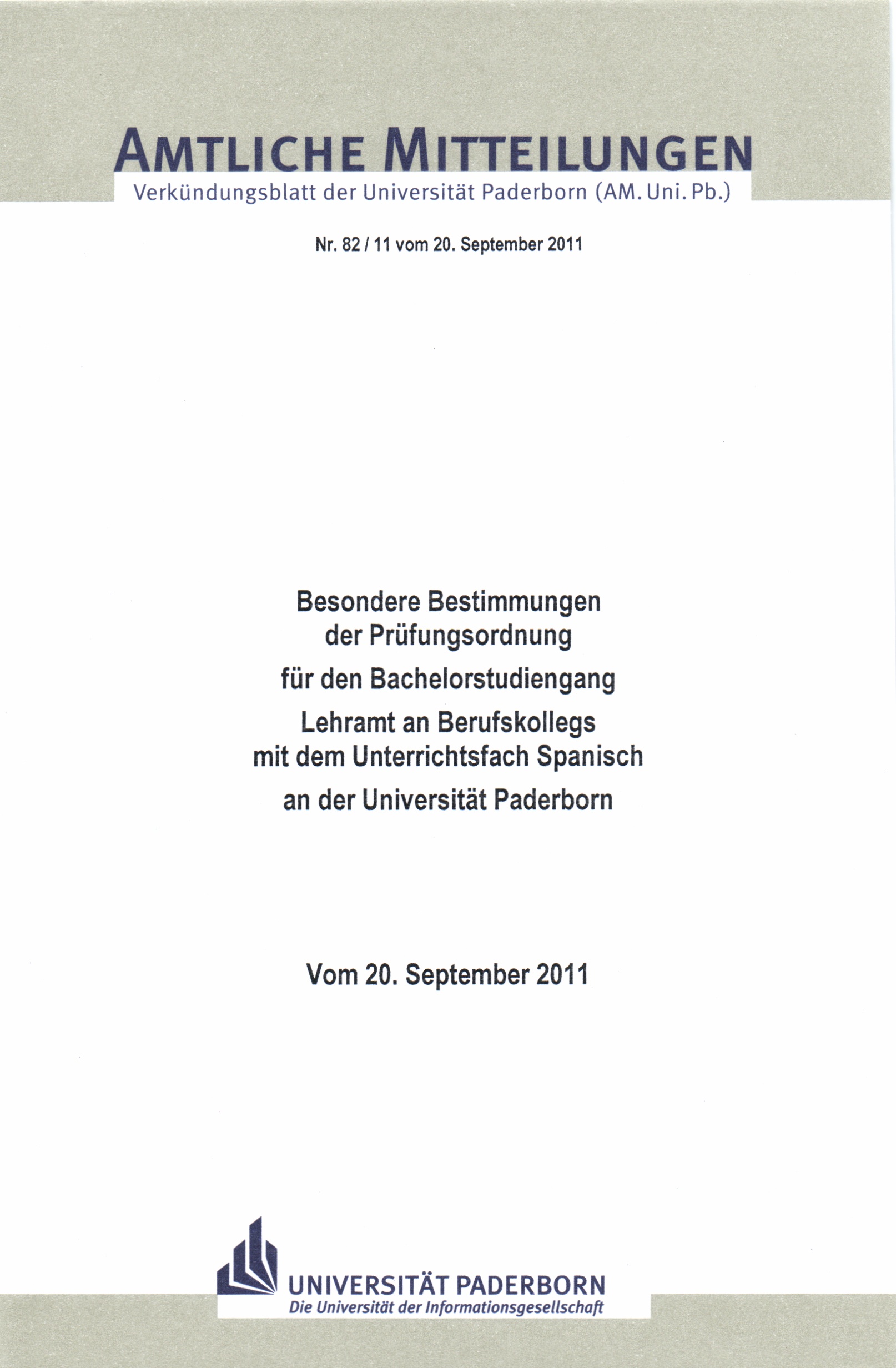 Besondere Bestimmungen der Prüfungsordnung für den Bachelorstudiengang Lehramt an Berufskollegs mit dem Unterrichtsfach Spanisch an der Universität Paderborn : vom 20. September 2011