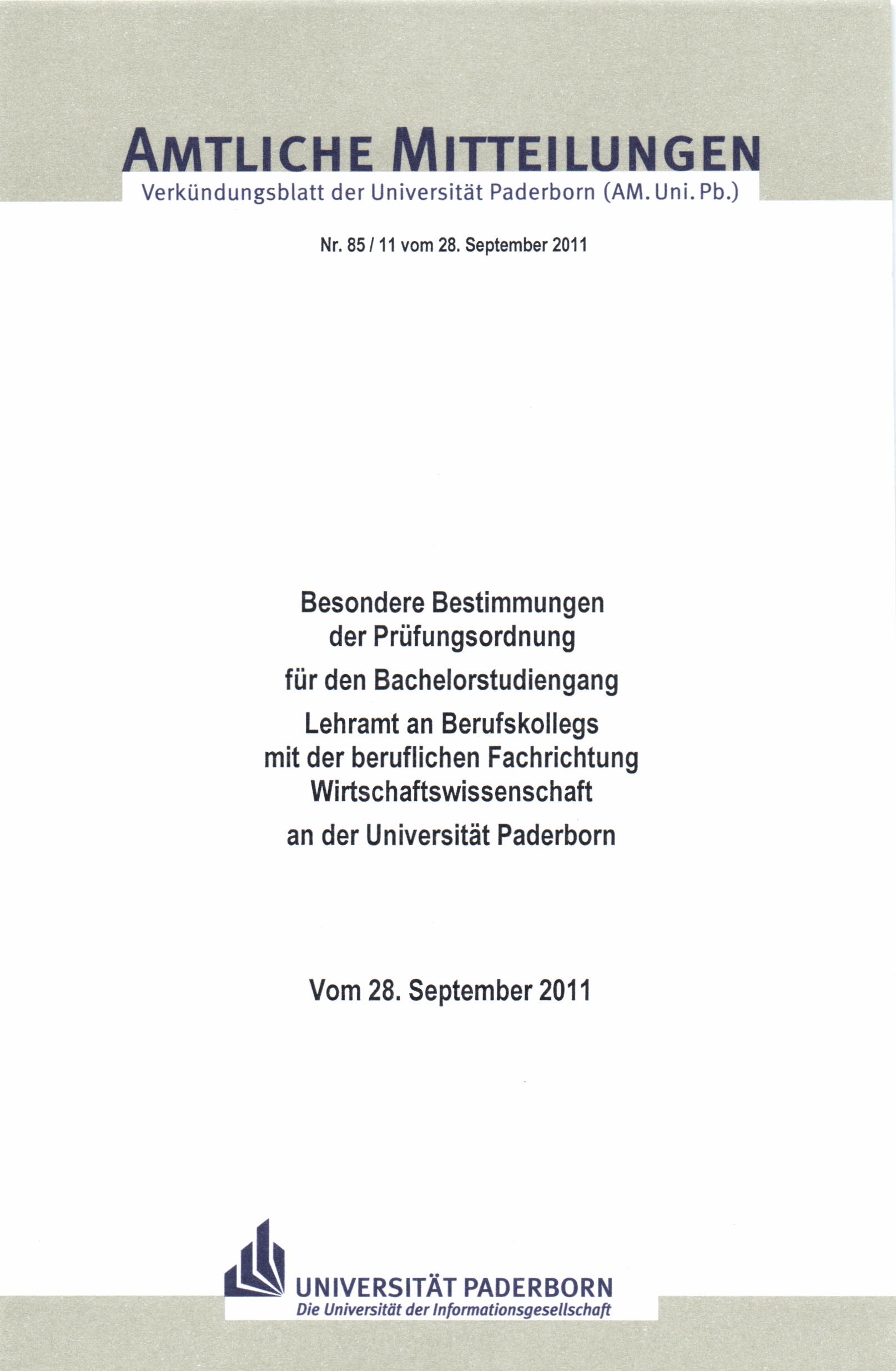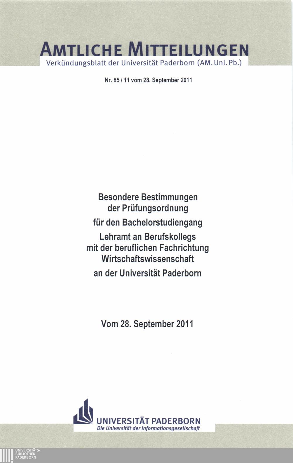 Besondere Bestimmungen der Prüfungsordnung für den Bachelorstudiengang Lehramt an Berufskollegs mit der beruflichen Fachrichtung Wirtschaftswissenschaft an der Universität Paderborn : vom 28. September 2011