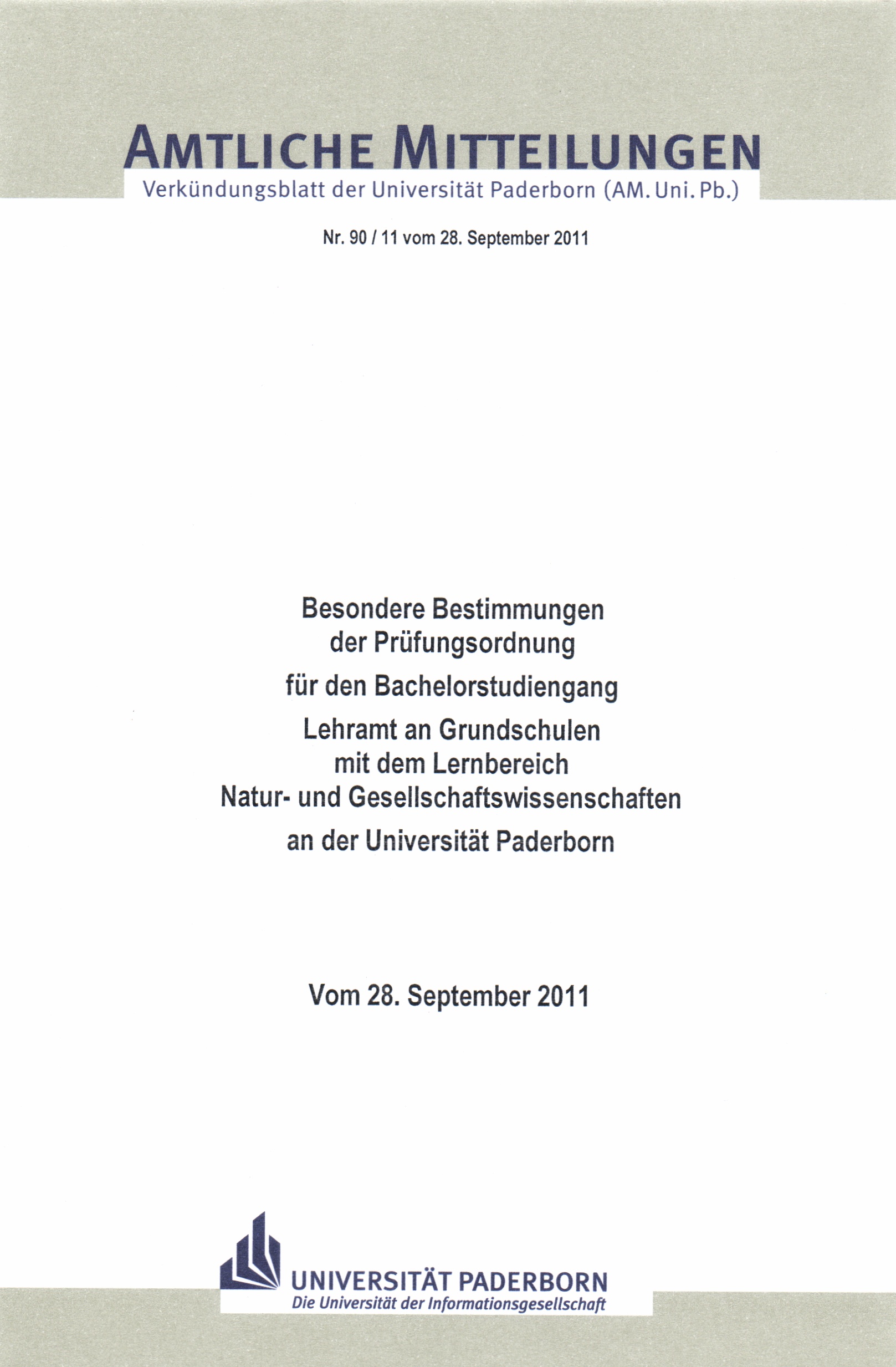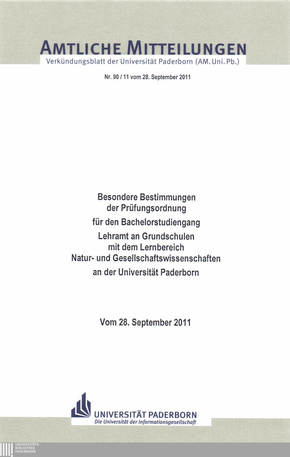 Besondere Bestimmungen der Prüfungsordnung für den Bachelorstudiengang Lehramt an Grundschulen mit dem Lernbereich Natur- und Gesellschaftswissenschaften an der Universität Paderborn : vom 28. September 2011