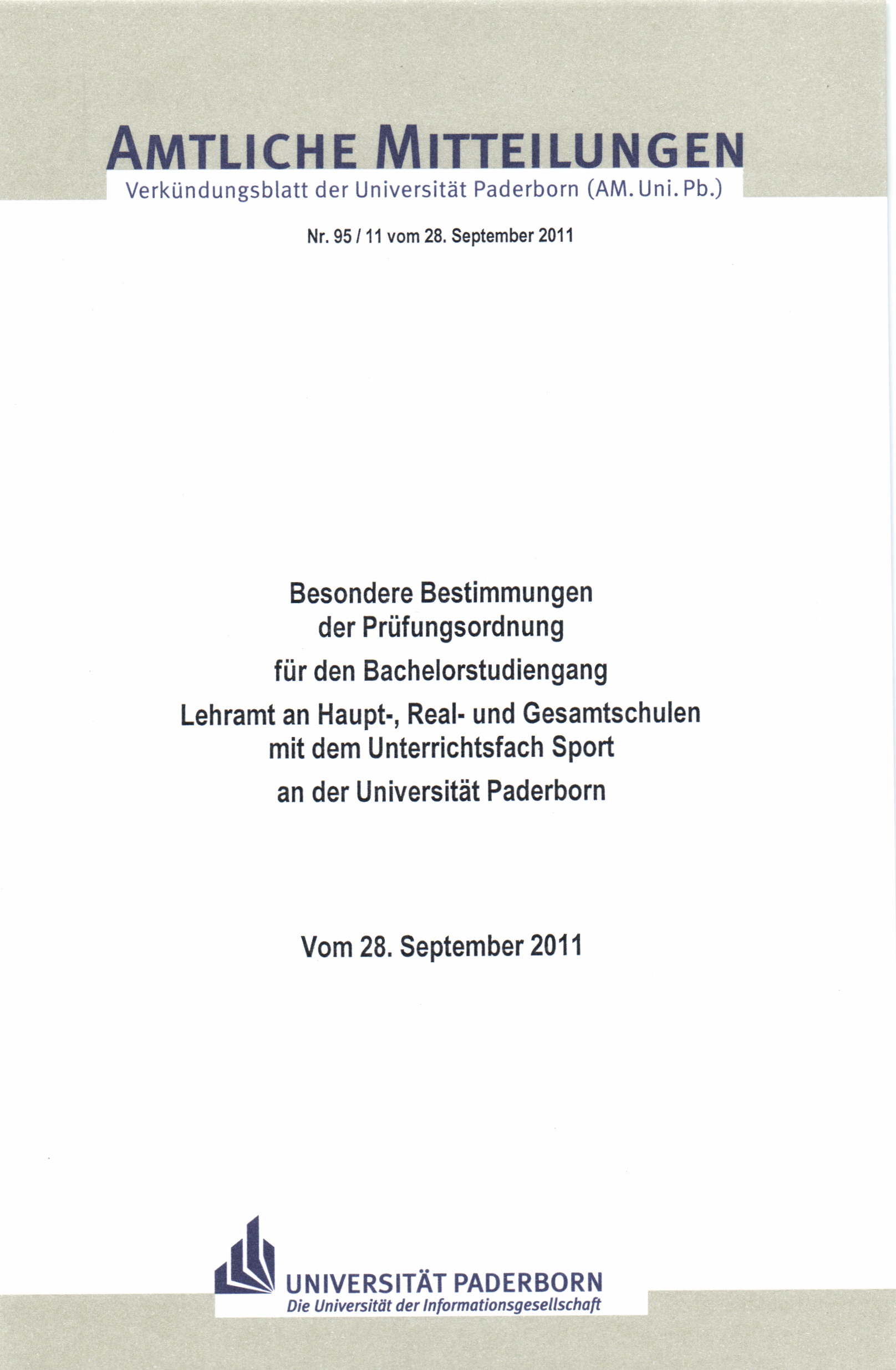 Besondere Bestimmungen der Prüfungsordnung für den Bachelorstudiengang Lehramt an Haupt-, Real- und Gesamtschulen mit dem Unterrichtsfach Sport an der Universität Paderborn : vom 28. September 2011