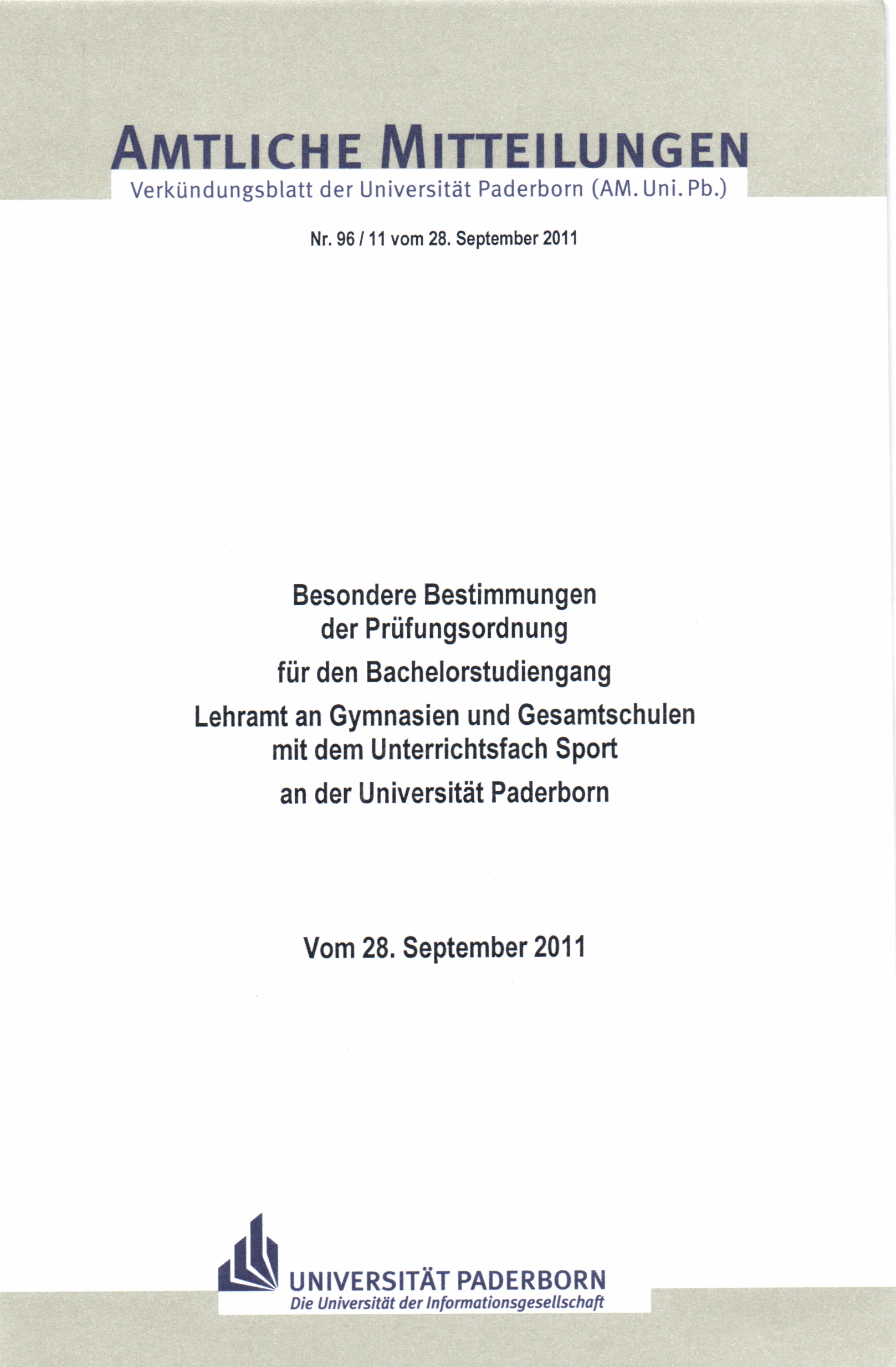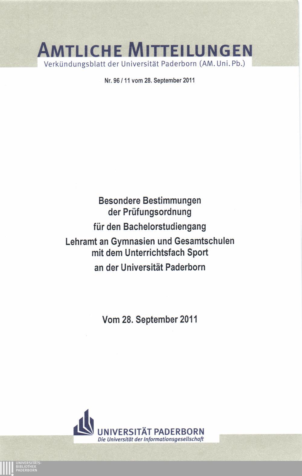 Besondere Bestimmungen der Prüfungsordnung für den Bachelorstudiengang Lehramt an Gymnasien und Gesamtschulen mit dem Unterrichtsfach Sport an der Universität Paderborn : vom 28. September 2011